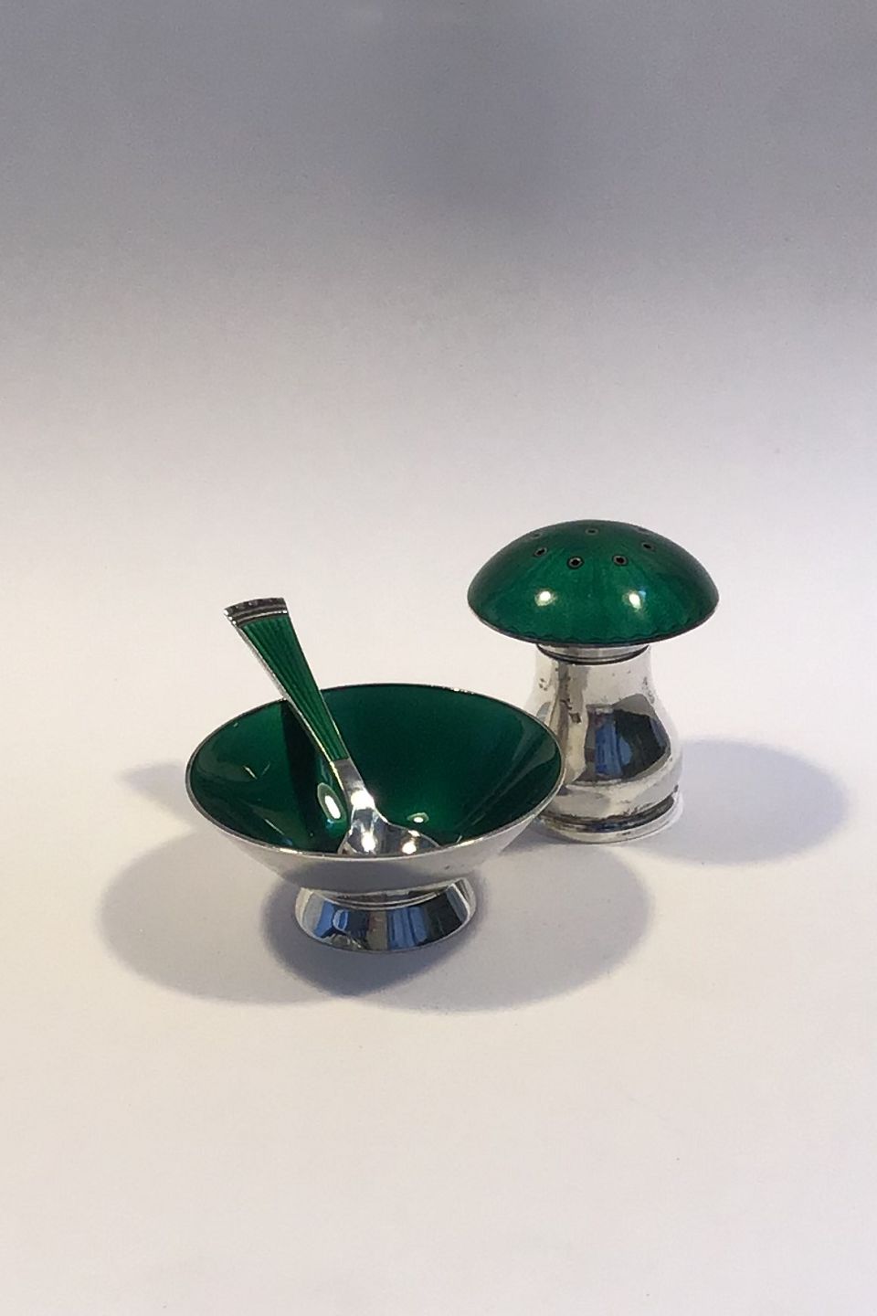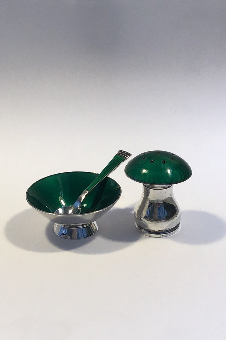 Egon Lauridsen Sterling Sølv Salt og Peber sæt (Grøn emalje) Måler Saltkar Diam 5.2 cm Peberbøsse H 4.3 cm