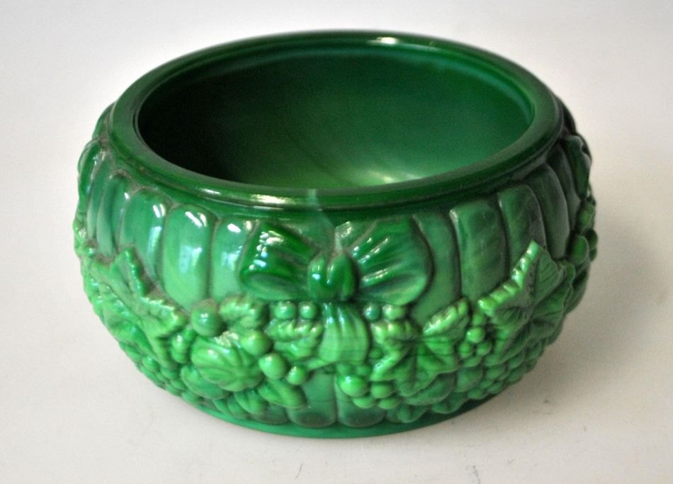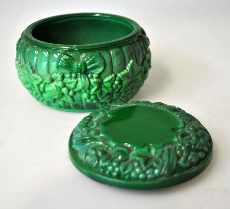 Rund skål med låg. Curt Schlevogt, Gablonz 1930'erne. Tyskland. Presset grøn glasmasse "malakit". Dekoreret i relief med blomster og ranker. Dia.: 9,5 cm. H.: 5 cm.