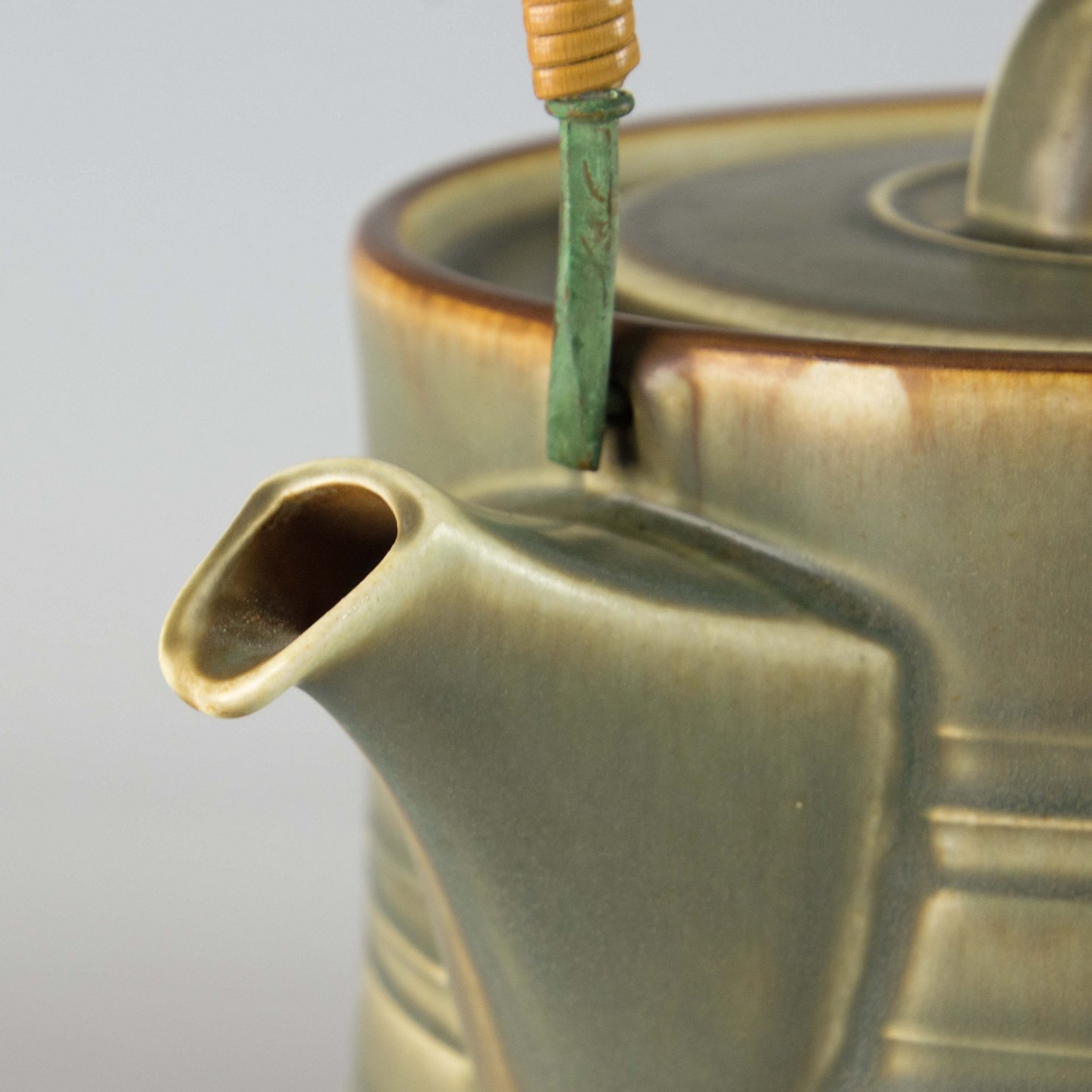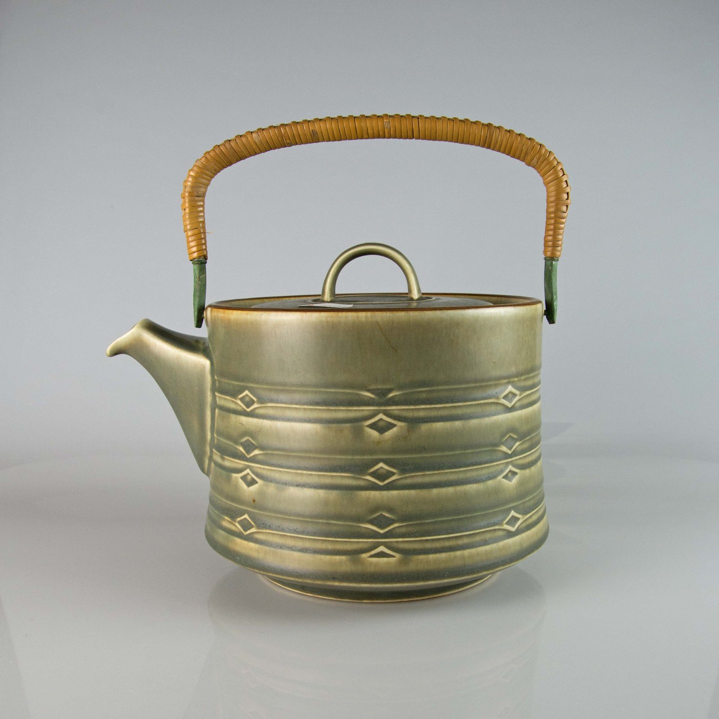 Kande i grøn stentøj med abstrakt motiv.