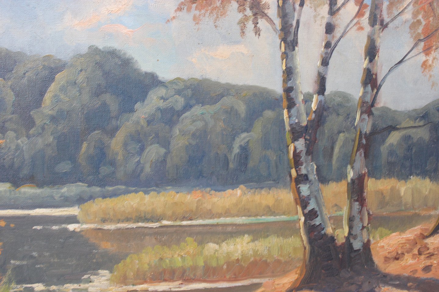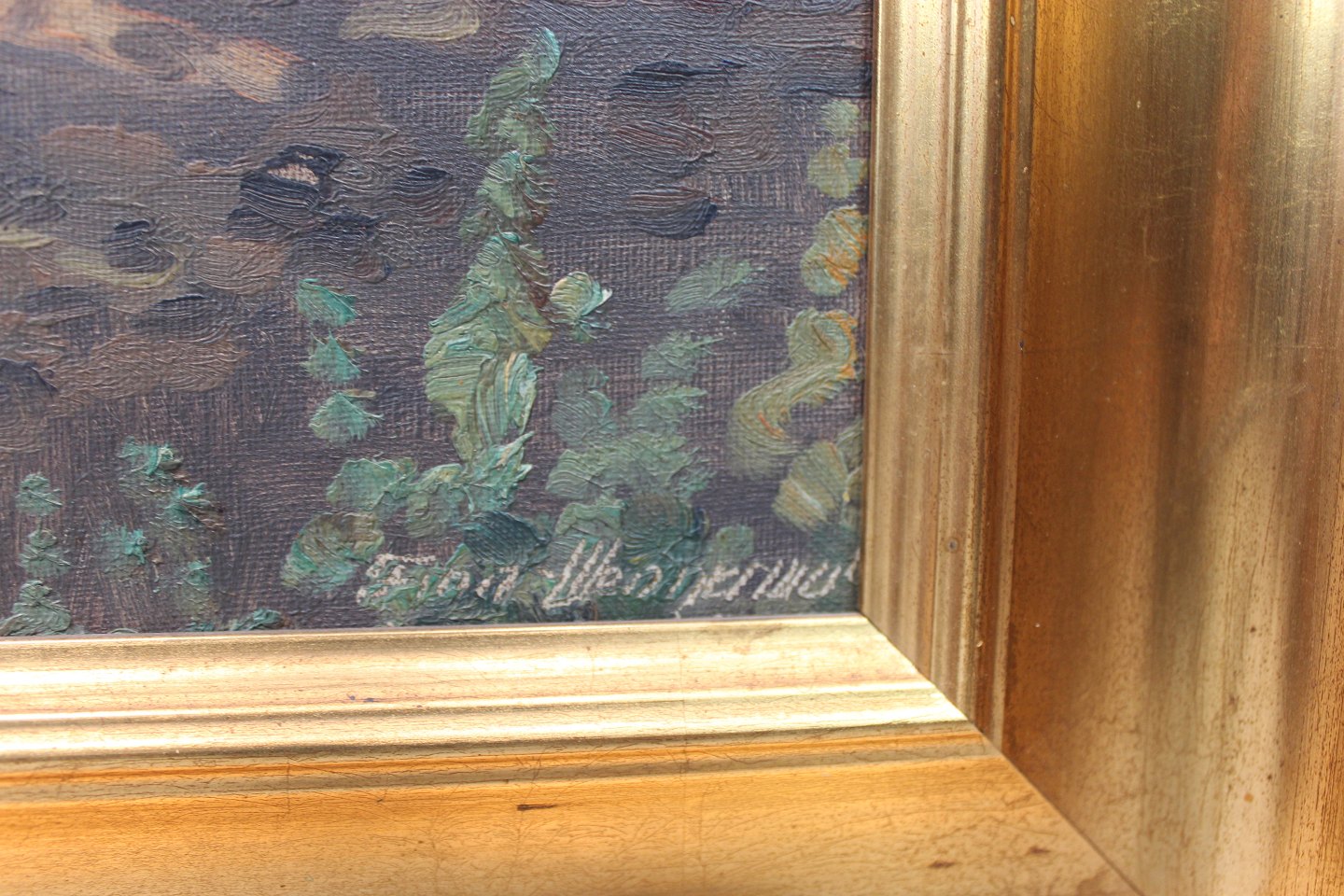 Maleri med skov motiv og guldramme signeret Finn Wennervald. Maleriet er i flot stand.