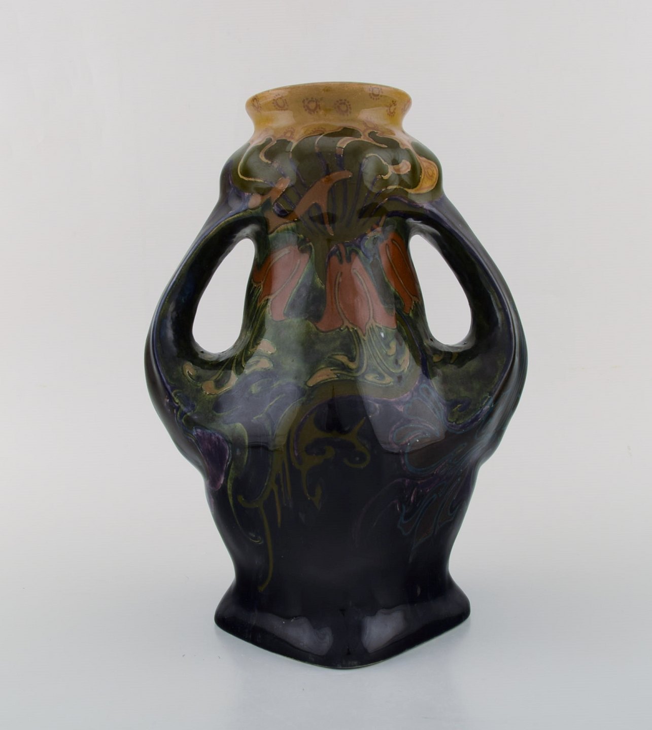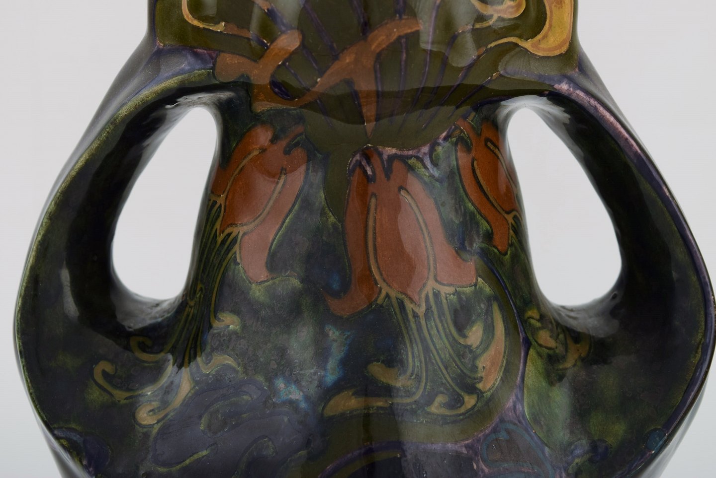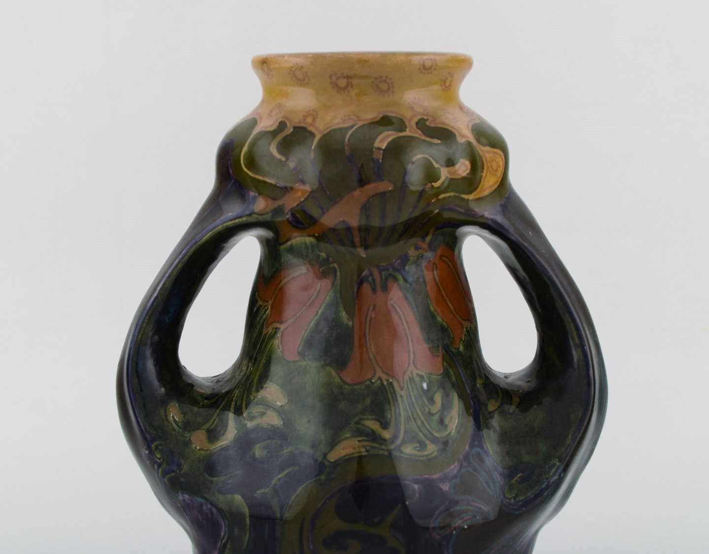 Rozenburg, Den Haag. Large art nouveau vase with gloves in glazed ceramics with flowers. 1910 / 20's.