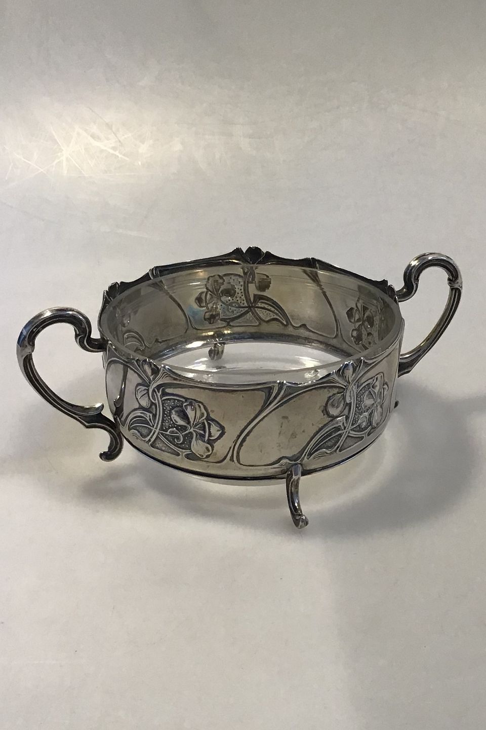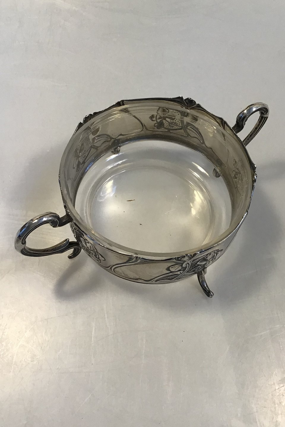 Sølvskål med glasindsats(Afslag) Måler H 7 cm Diam 12 cm Samlet Vægt 247 gr