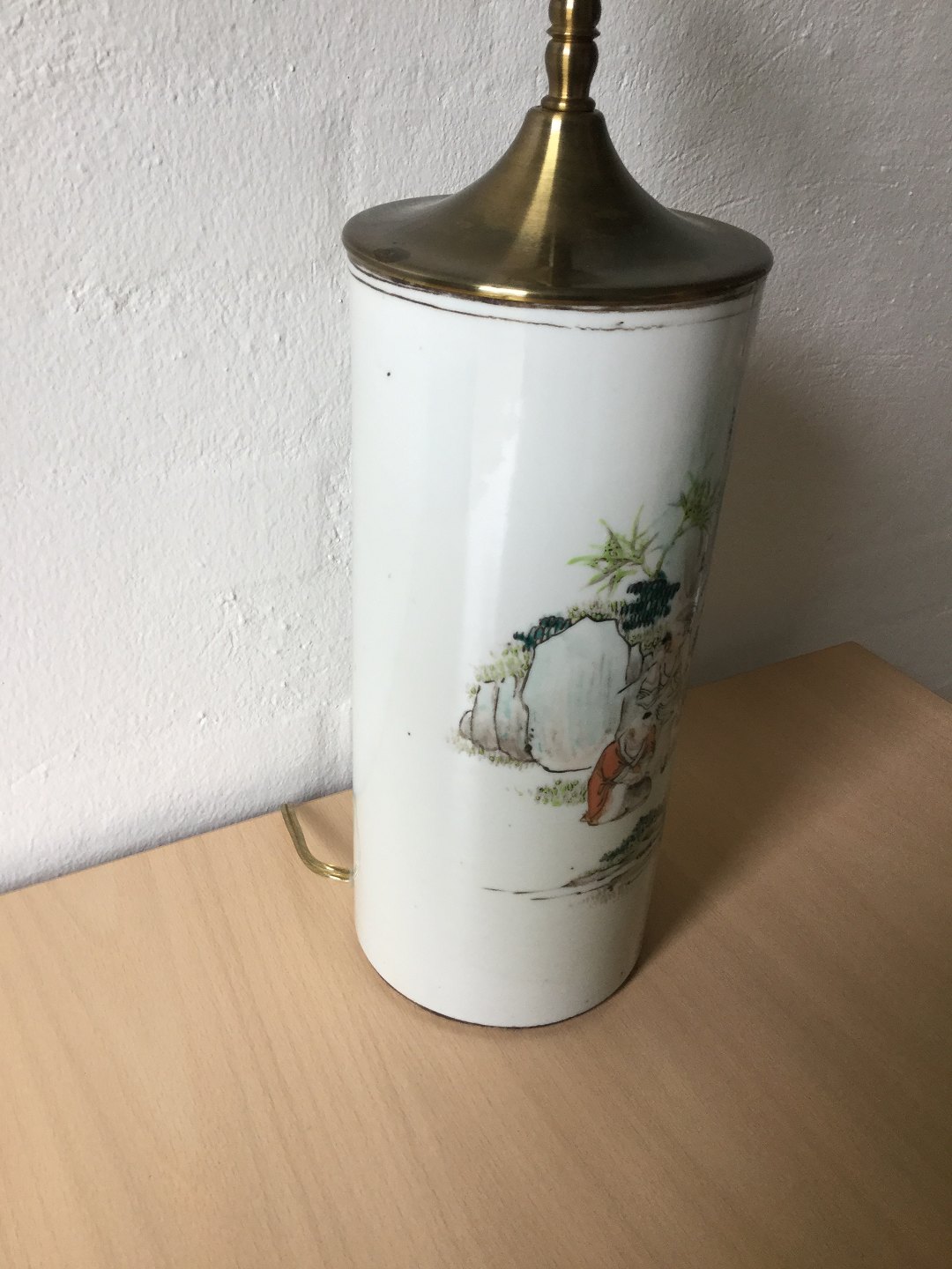 Polykromt dekoreret med personer i landskab der fisker samt skriftstegn.