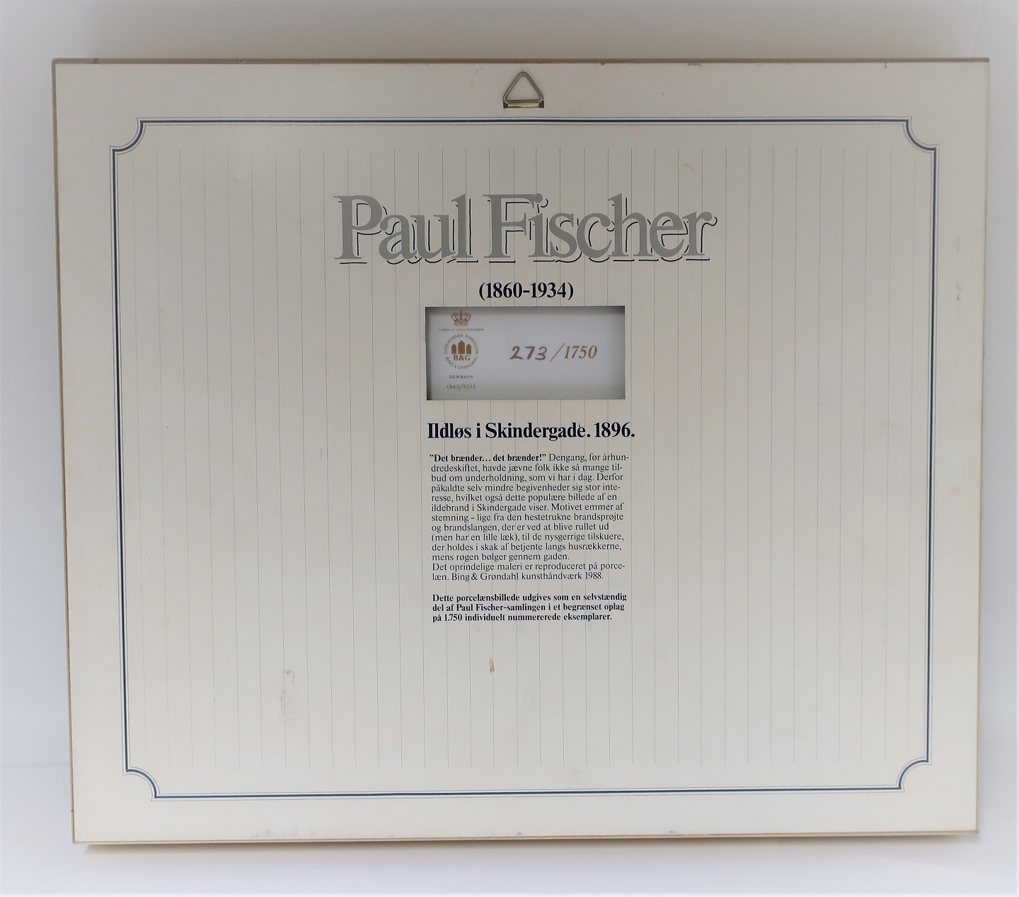 Bing & Grøndahl. Porcelæn maleri. Motiv af Paul Fischer. Ild i Skindergade. Størrelse inclusiv ramme, 40*33 cm. Produceret 1750 styk. Dette har nummer 273.