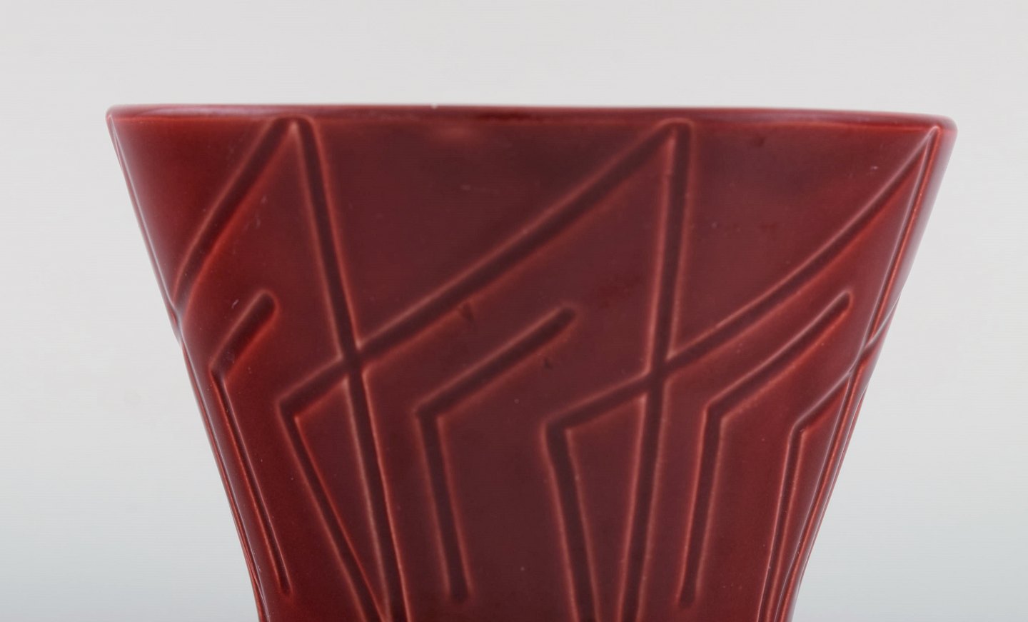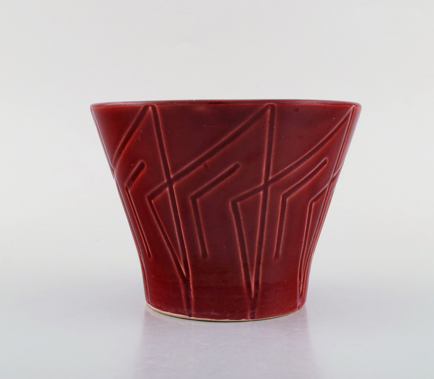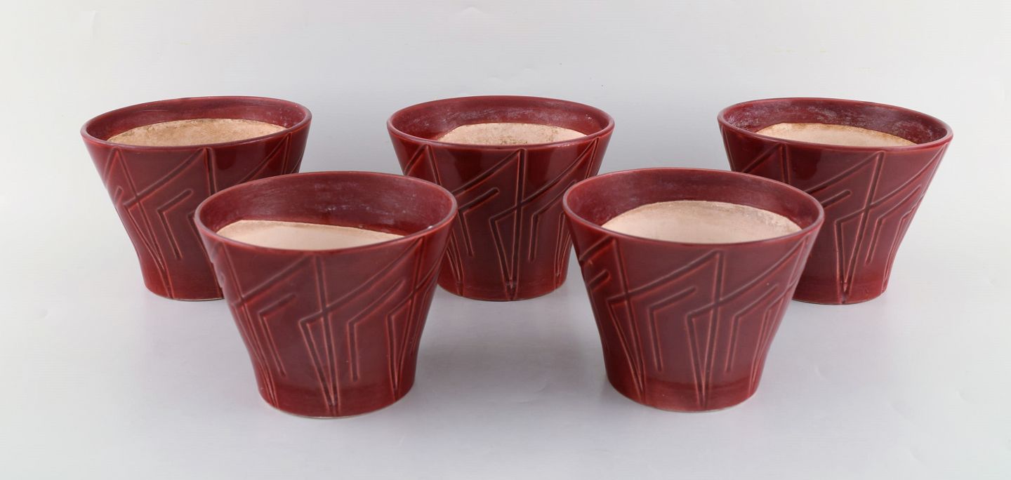 Five Bo Fajans Marianne flower pots in glazed ceramic. Beautiful red glaze and geometric pattern. Swedish design, 1960s / 70's.
