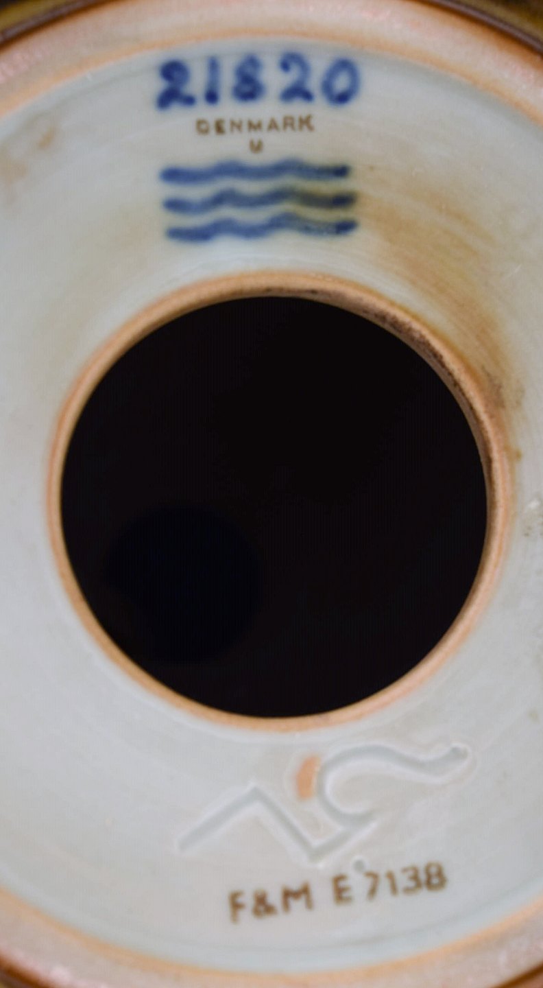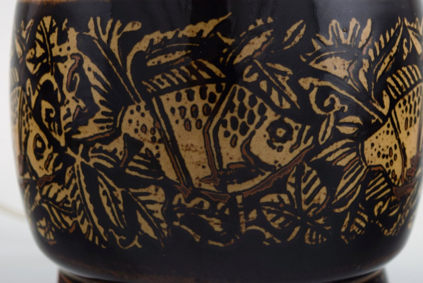 Nils Thorsson (1898-1975) for Royal Copenhagen. To bordlamper af stentøj opsat på fire fødder dekoreret med fiskemotiver.