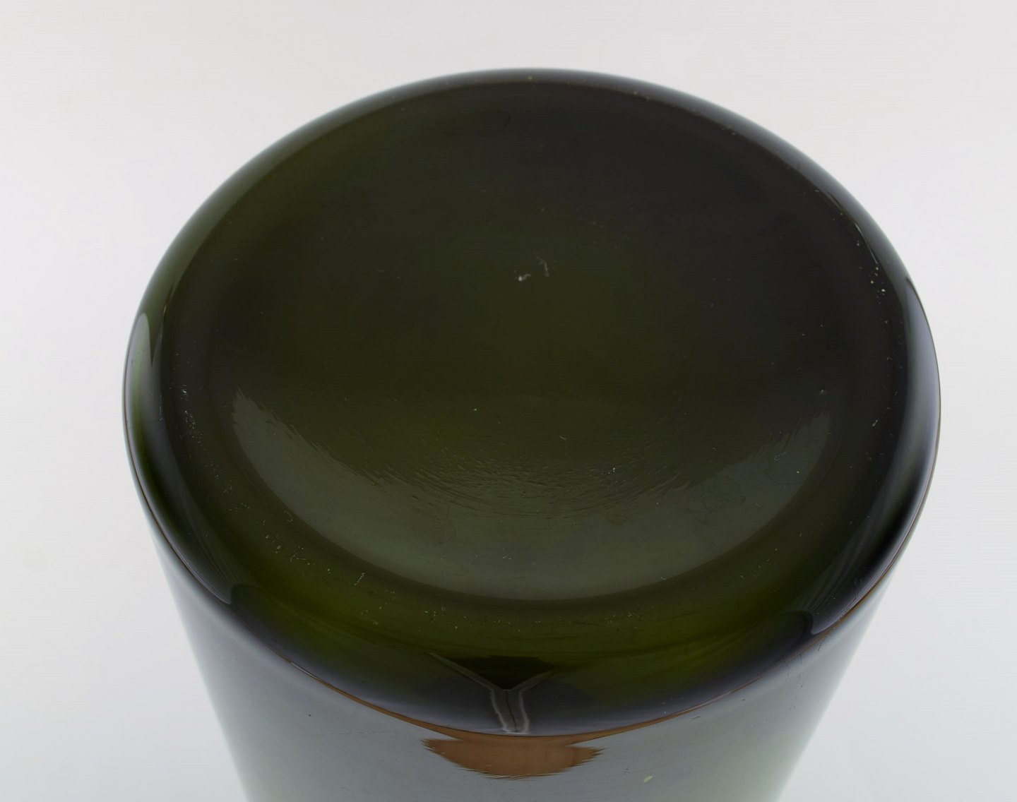 Otto Brauer for Holmegaard. Stor vase/flaske i grønt kunstglas med blå kugle. 1960'erne.