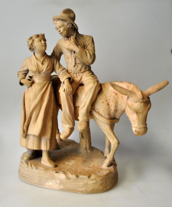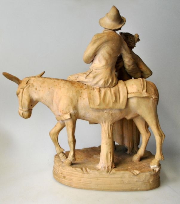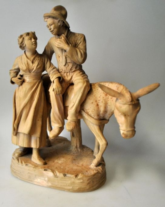 Italiensk figurgruppe i rødler, 19. årh. Stemplet: Cipolla Calogord og Messina. Unika. Figur af ung mand, kvinde og æsel. H.: 30 cm. L.: 27,5 cm.