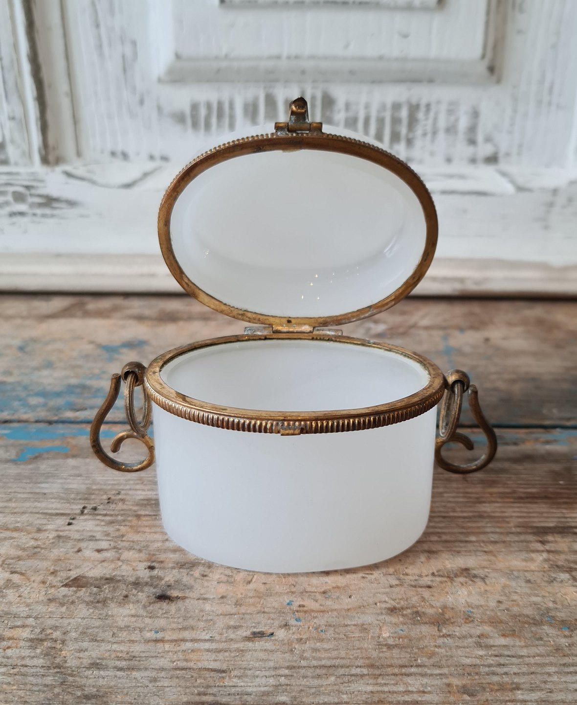 1800 tals kandisskrin i hvidt opalglas med forgyldt bronze montering - sjælden lille størrelse.