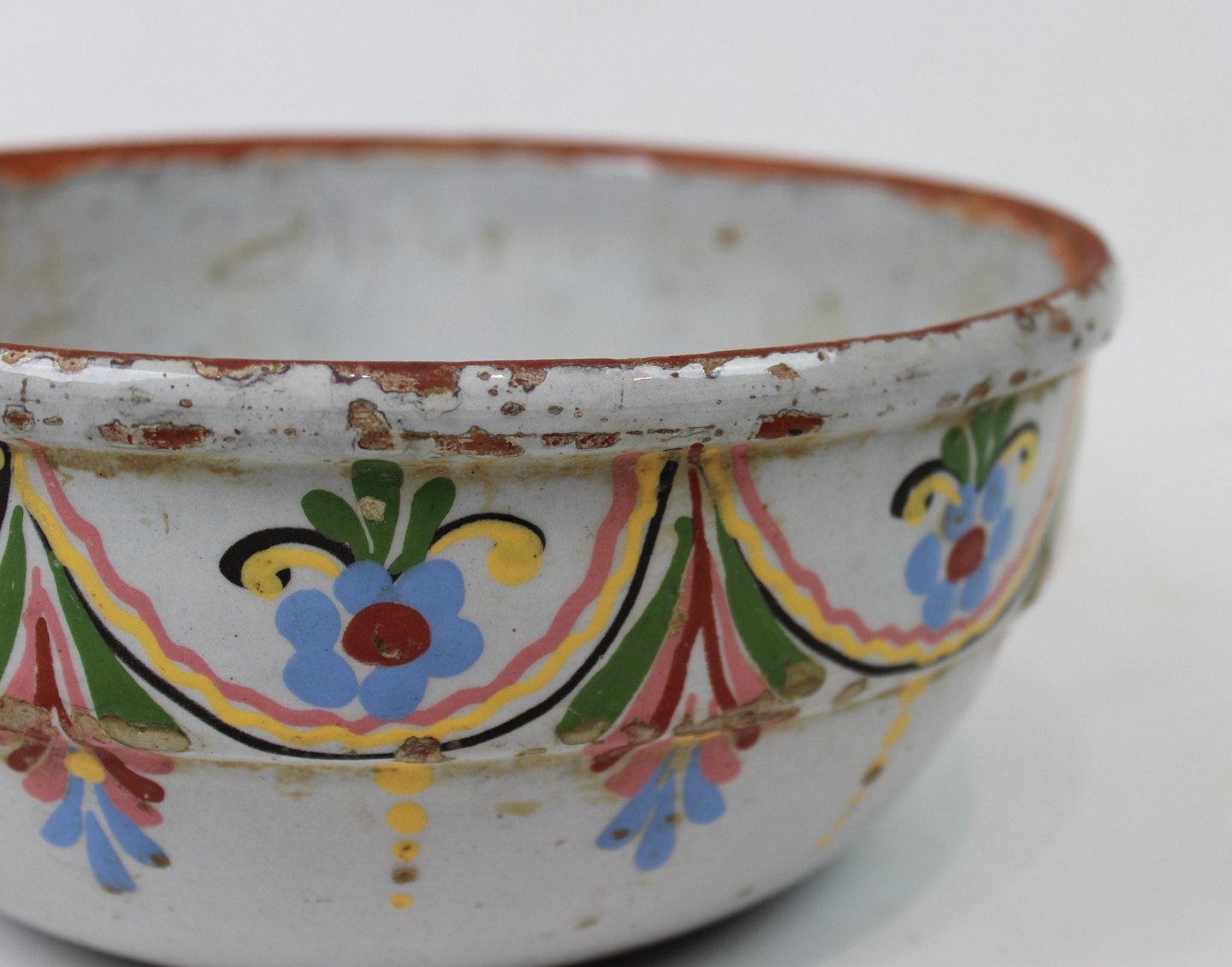Ler skål dekoreret med lyse farver fra omkring år 1880. Skålen er i flot brugt stand.
