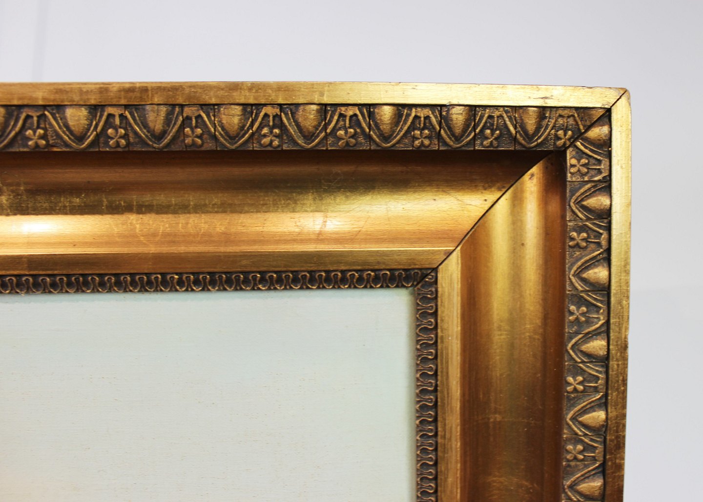 Oliemaleri i varme farver med motiv af marker og stråtækt hus med forgyldt ramme.