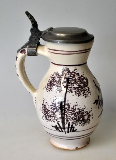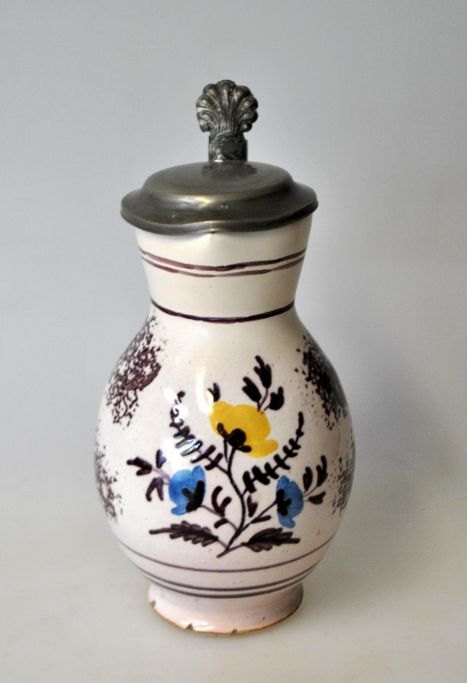 Lille fajance kande med tinlåg, 19. årh. Tyskland. Cremefarvet, polykrom dekoreret med træer og blomster. H.: 15 cm.