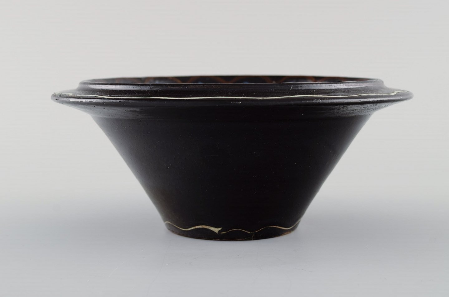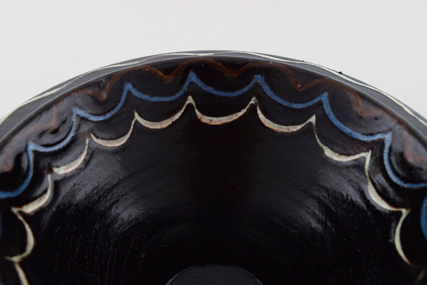 Kähler, HAK. Skål i sortglaseret keramik med blå og hvide bølger langs kanten. 1930/40'erne.