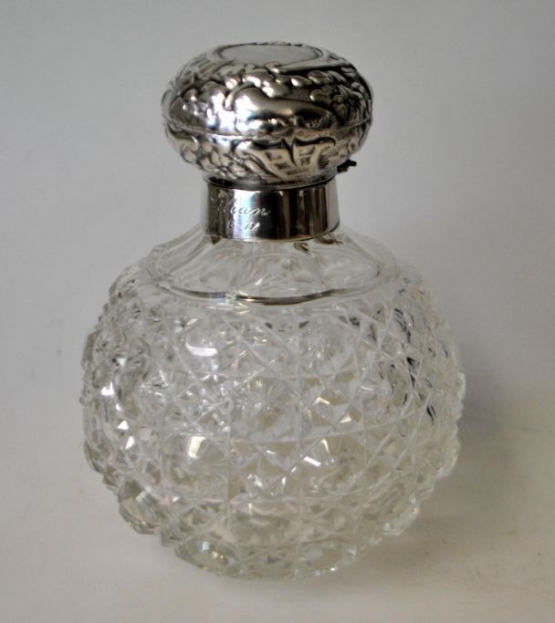 Engelsk parfume flacon i slebet krystal med sølvlåg, 19/20. årh. Stemplet.