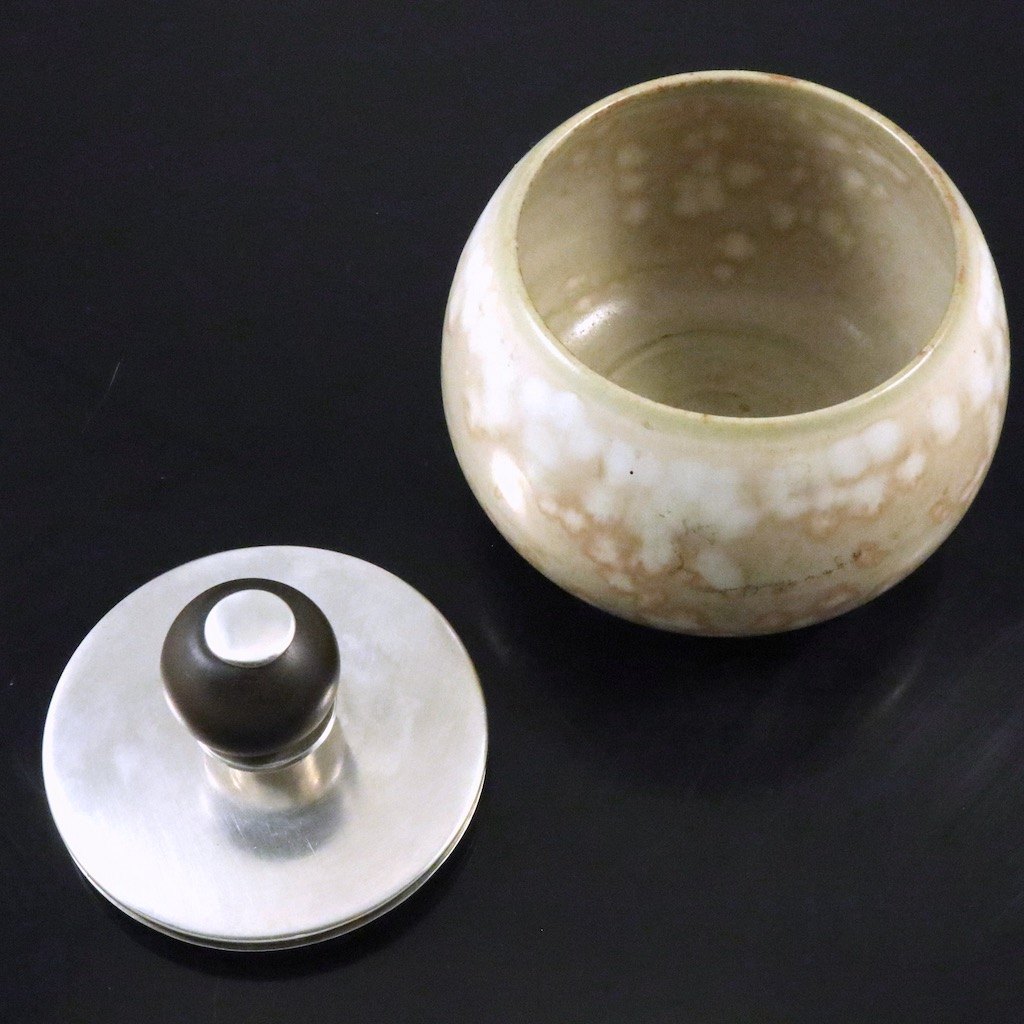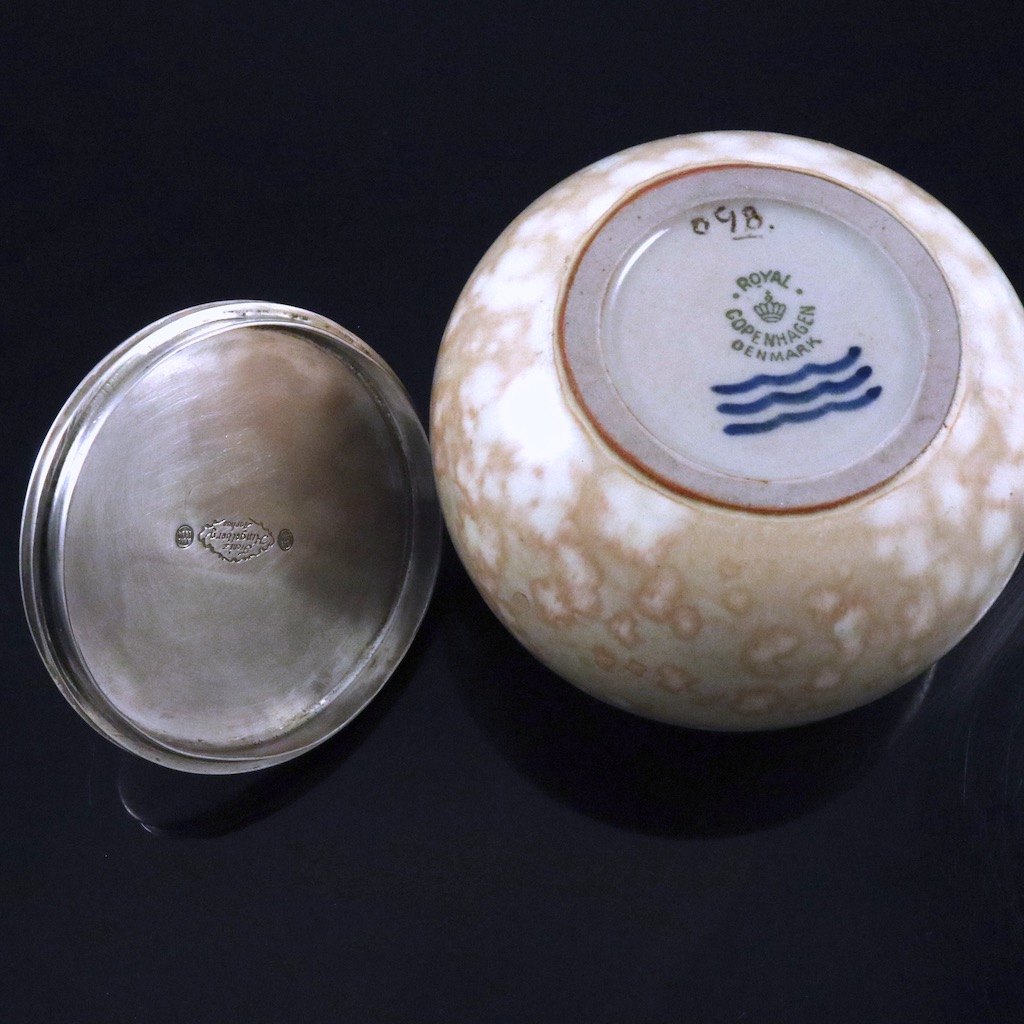 Royal Copenhagen - Hingelberg. Krukke i stentøj med låg i Sterling Sølv.