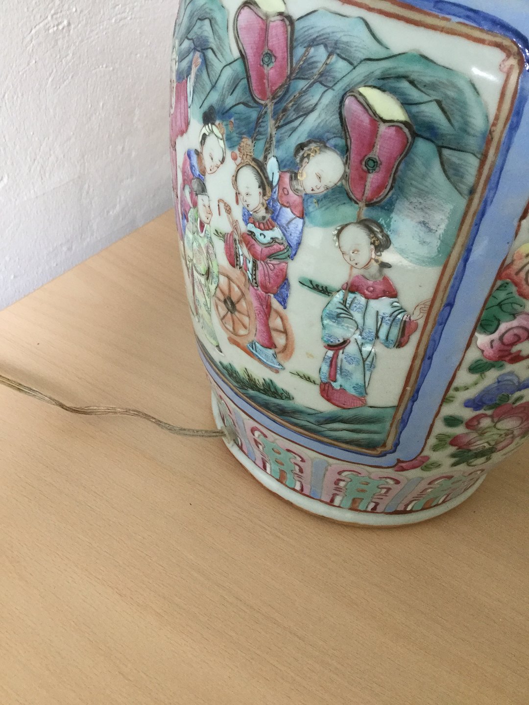 Omlavet til bordlampe med messingmontering. Halsen antagelig slebet ned før montering.