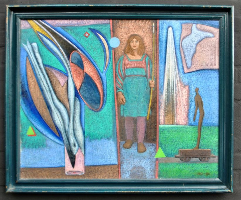 Gregersen, Hans (1951 - ) Danmark: Mellem datid og fremtid. Olie på lærred. Signeret 1980. Verso betegnet. 61 x 78 cm.