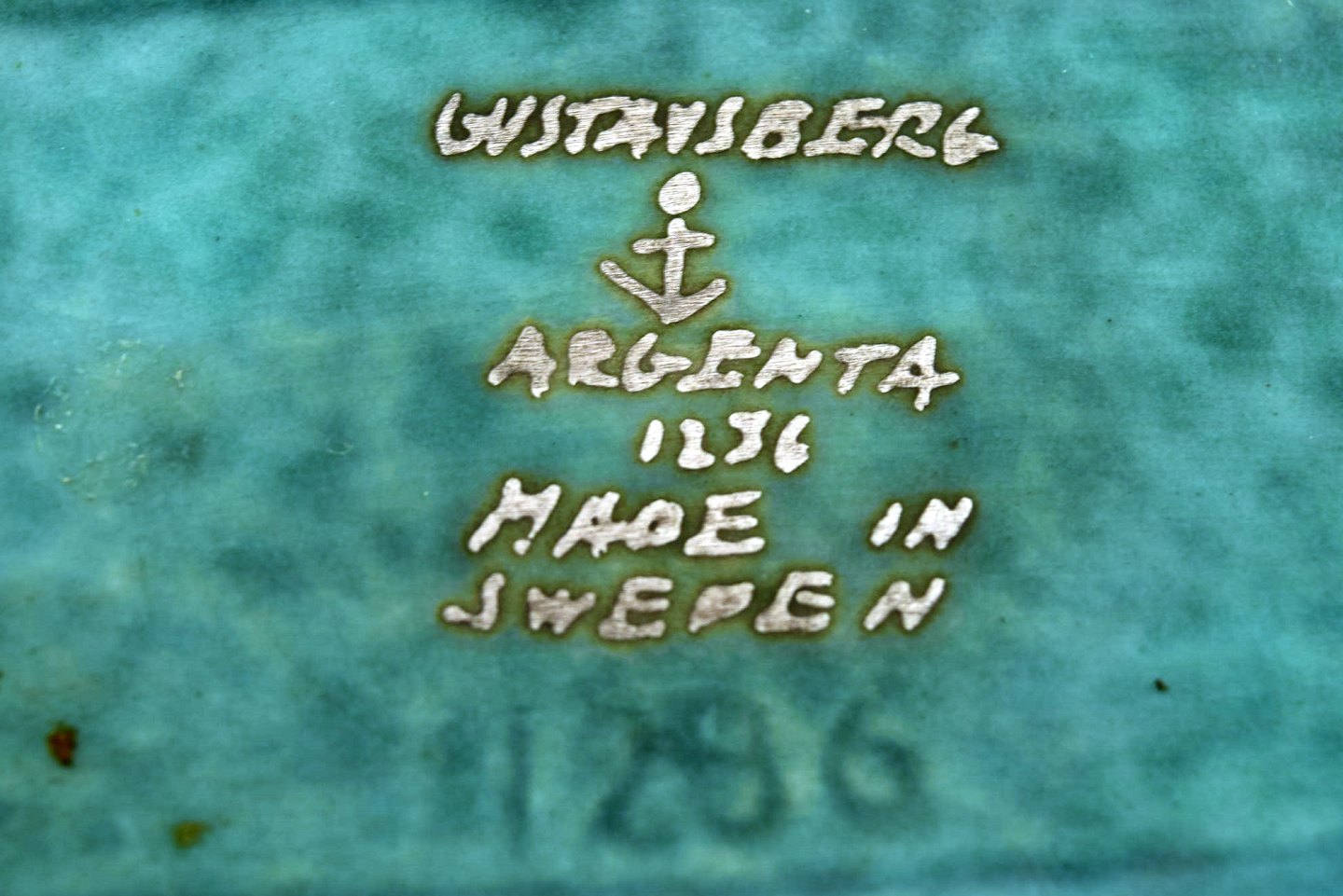 Wilhelm Kåge for Gustavsberg. Argenta art deco lågkrukke i glaseret keramik dekoreret med nøgen kvinde i sølvindlæg.