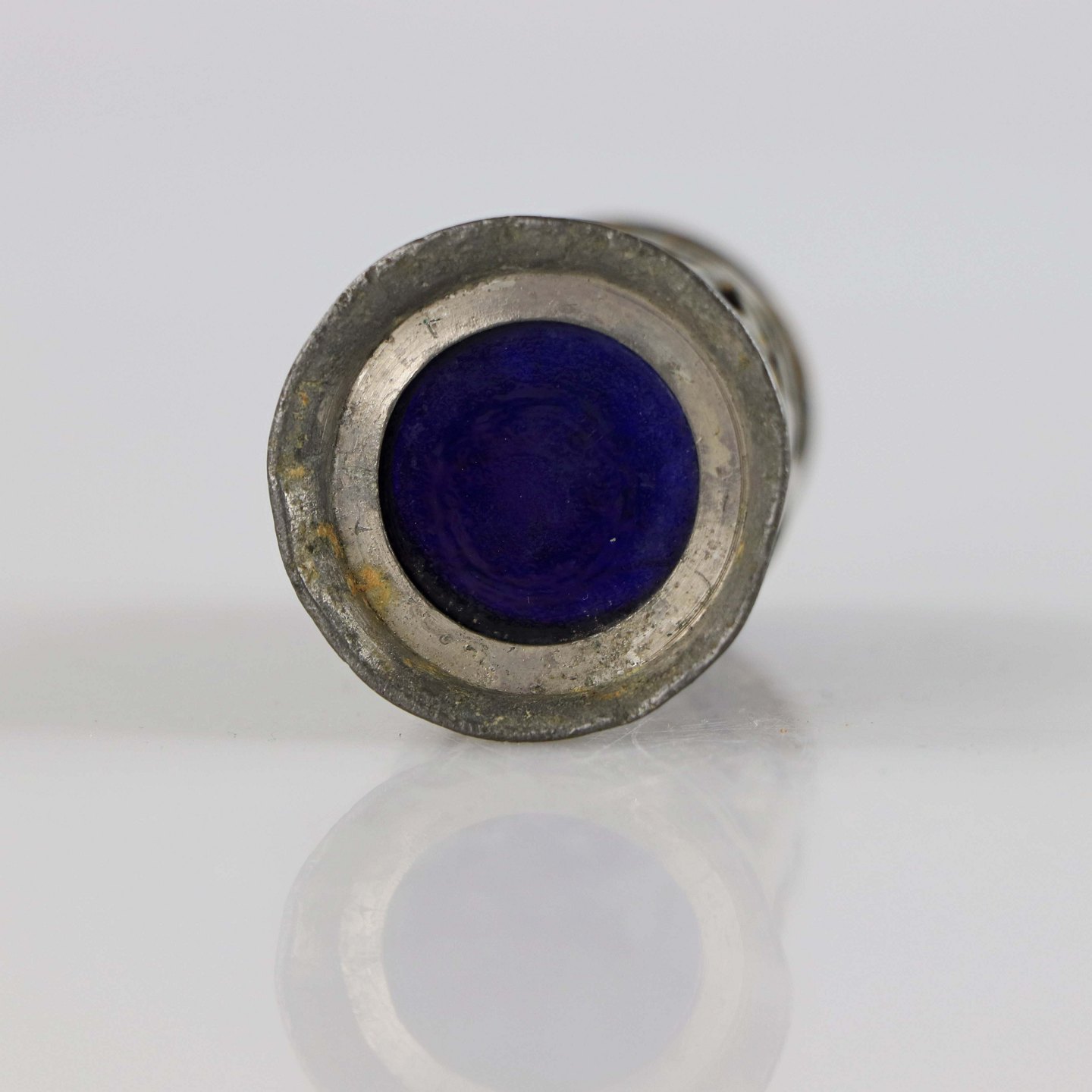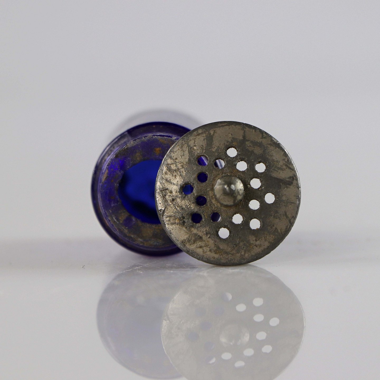 Saltbøsse med blå glas beholder med låg og holder i metal
