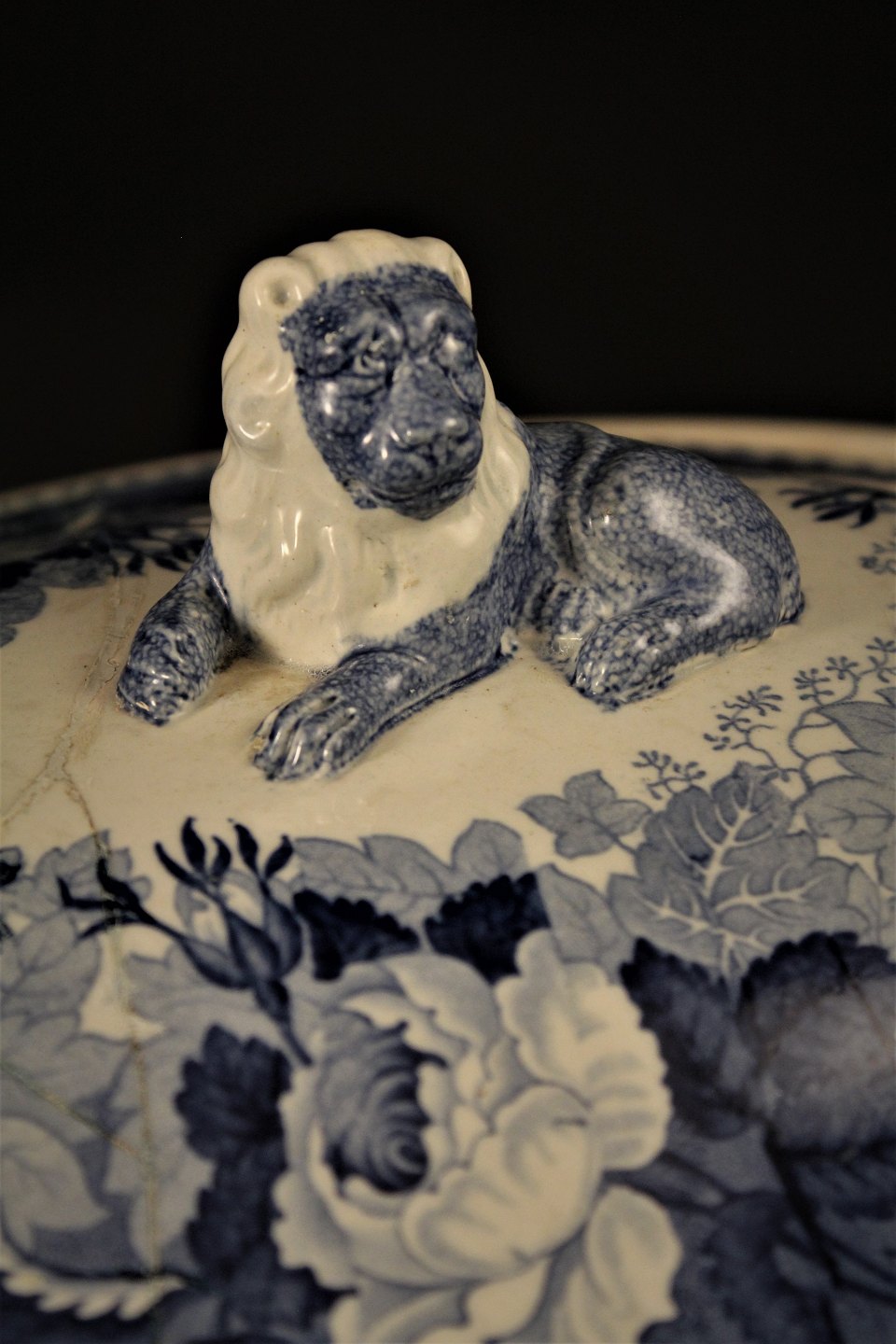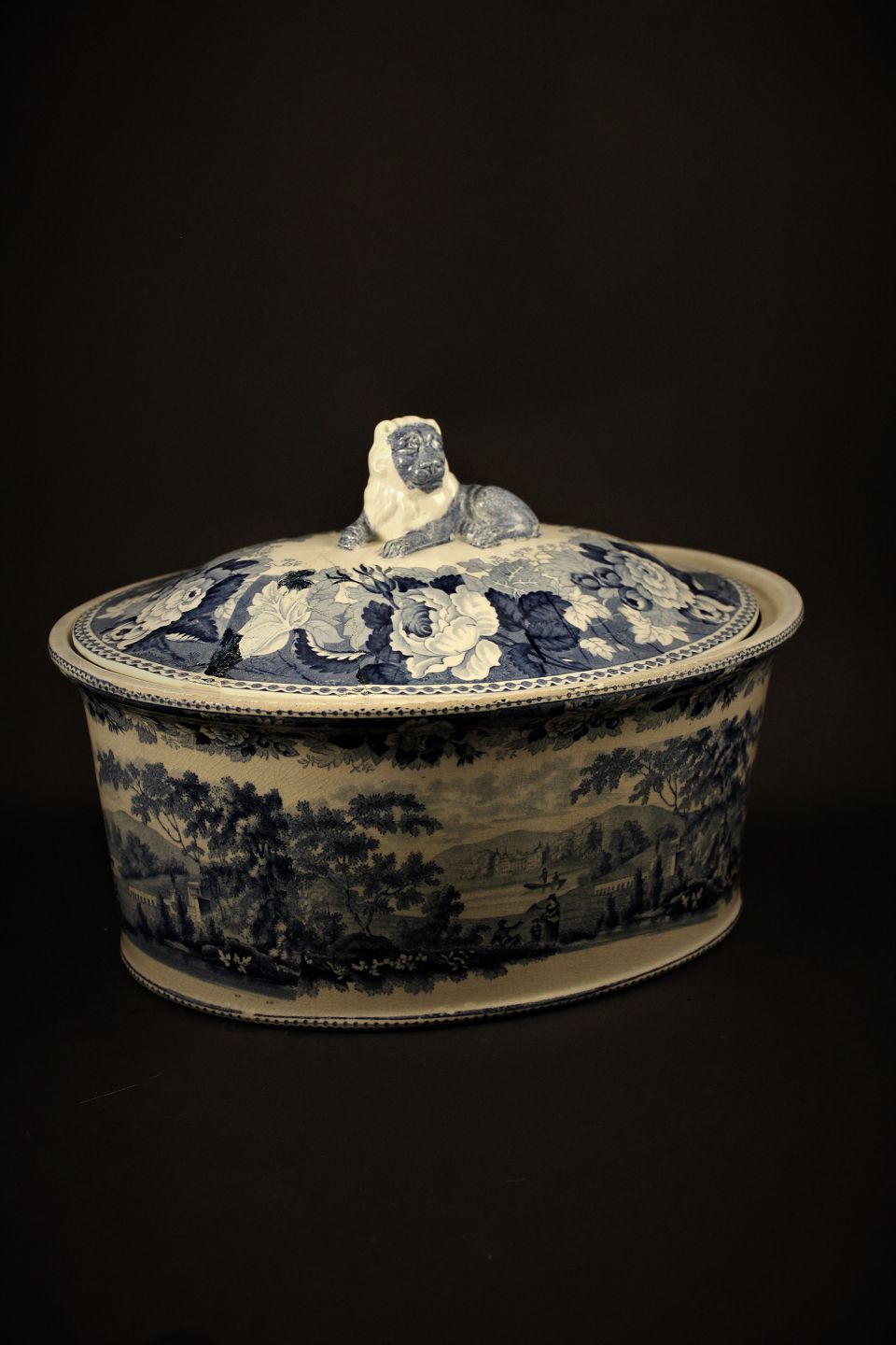 Antik oval , svensk 1800 tals Rørstrand postej terrin i fajance med blå glasur med landskabs motiver og liggende løve på toppen af låget.