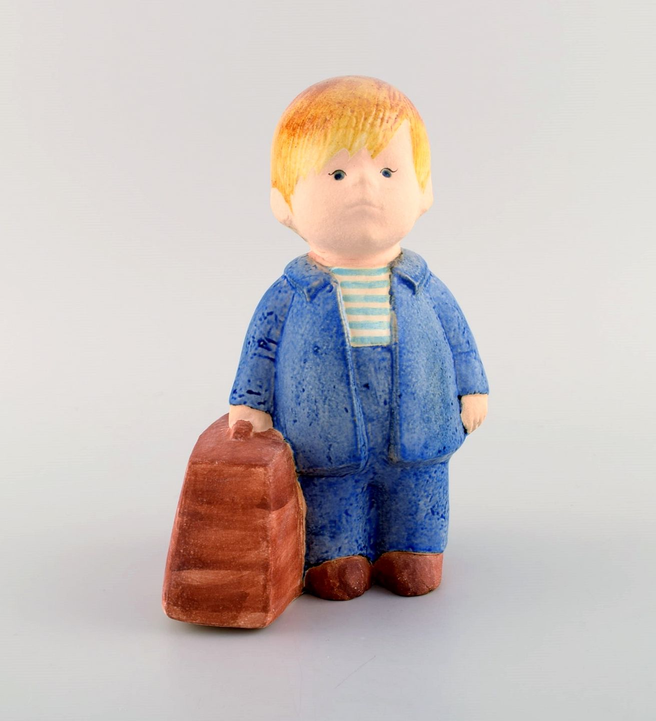 Lisa Larson for Gustavsberg. Sjælden figur i glaseret keramik. Dreng med taske. 1970/80'erne.