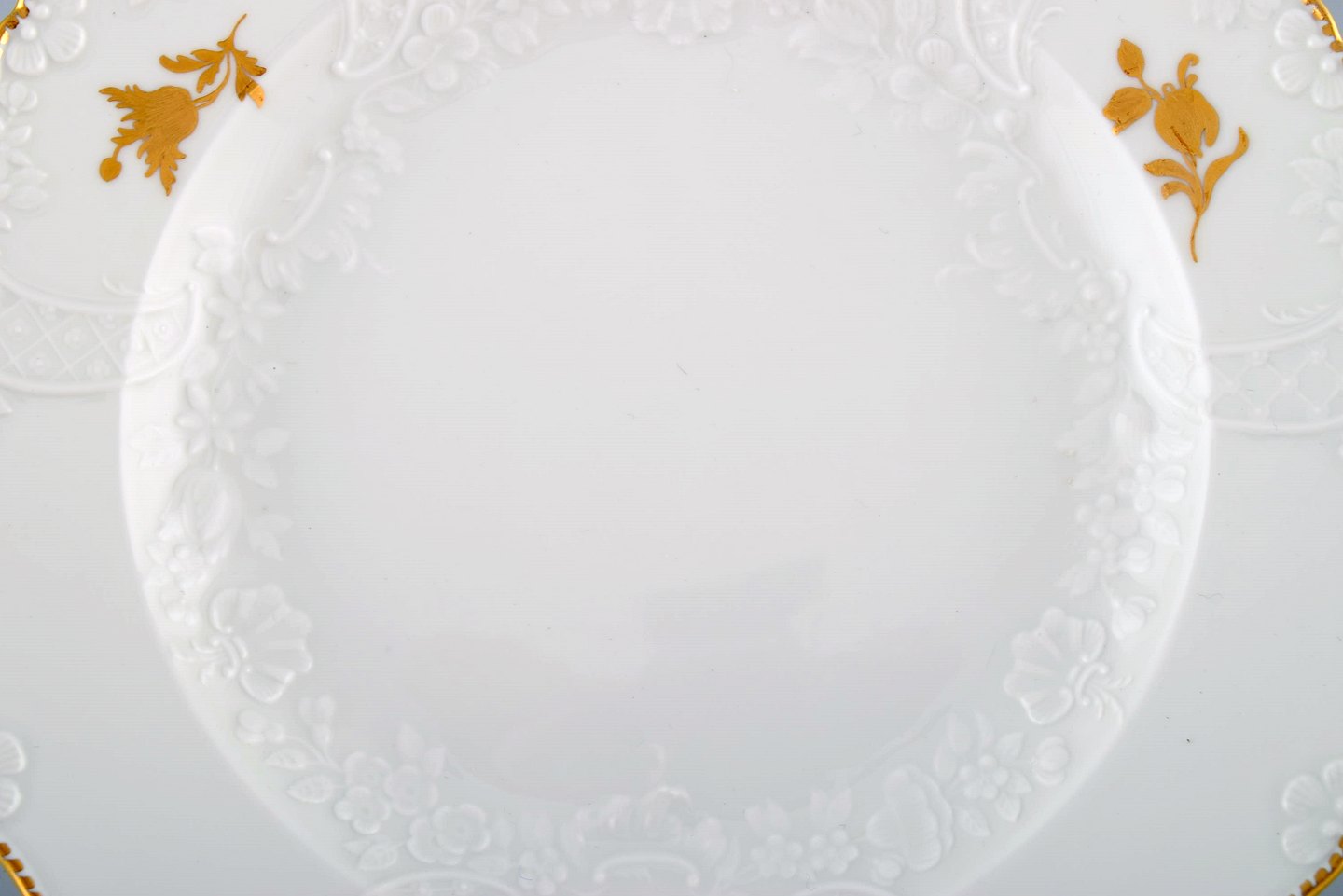 Meissen frokosttallerken i porcelæn med blomster og bladværk i relief og gulddekoration. 1900-tallet.