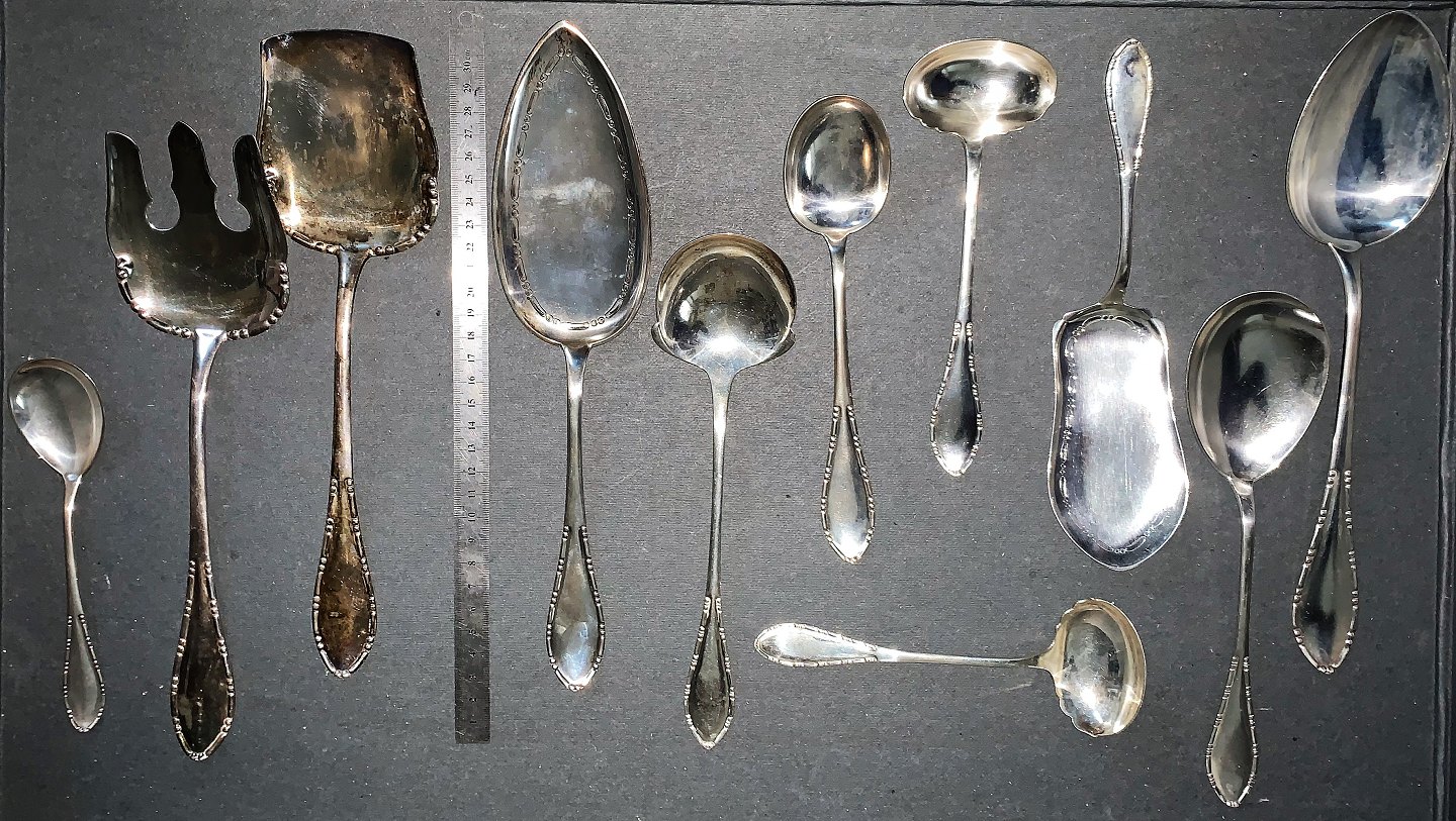 Vi et stort udvalg af serveringsdele og andre specielle dele i Ny Perle sølvbestik.