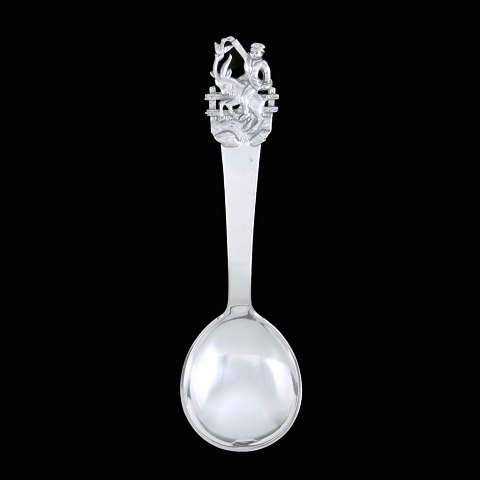 H.C. Andersen Eventyrbestik. 'Klodshans'. Rund barne/dessert i sølv med motiv fra H.C. Andersens eventyr. L. 14,5 cm.