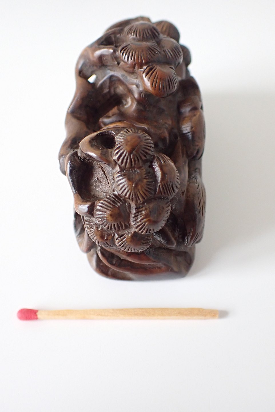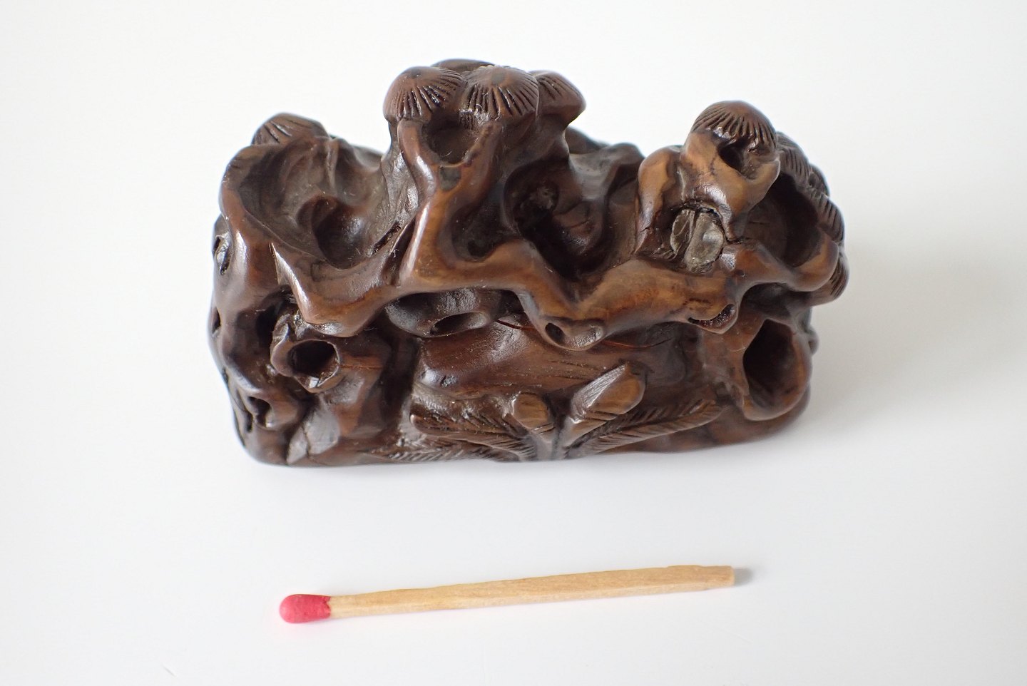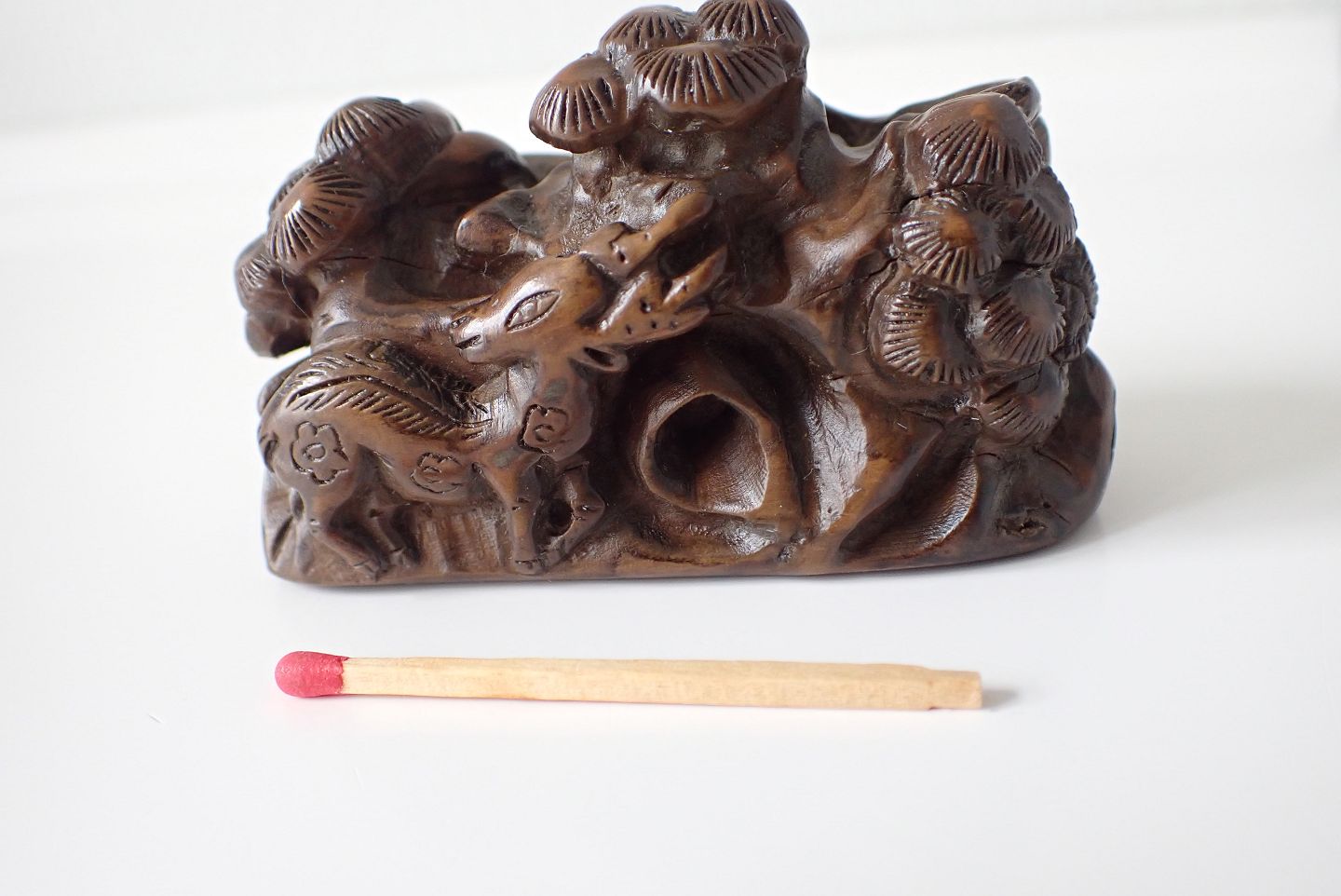 Lille Japansk træskæring (okimono) med hjort, japsndk klippede og krogede fyrretræer og bregne. Mål: 7,4 x 4,5 x 3,5 cm. I fin stand dog med et par overfladiske tørrevner.