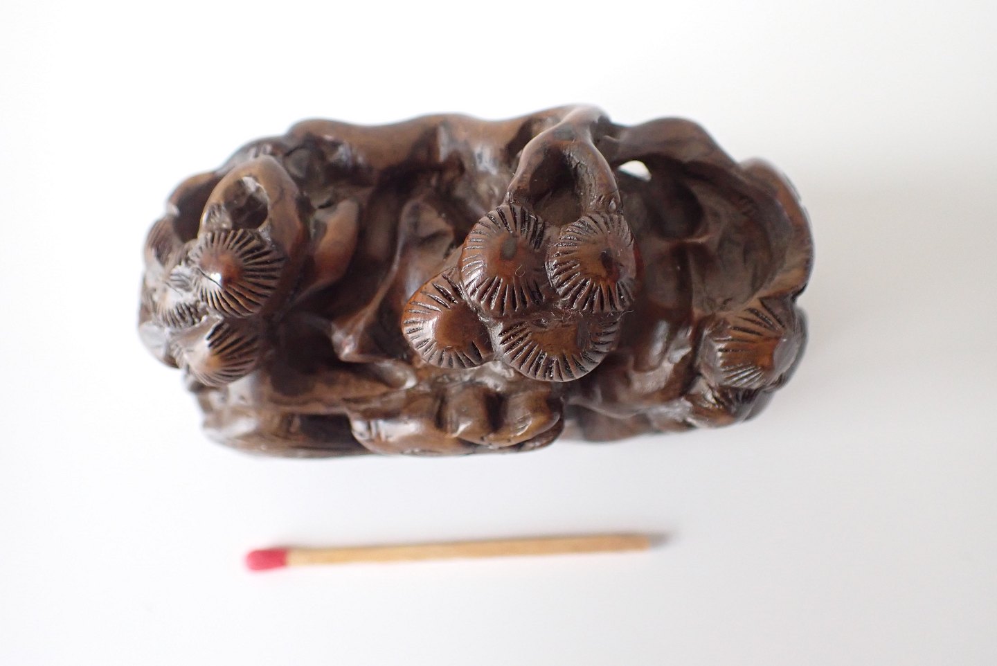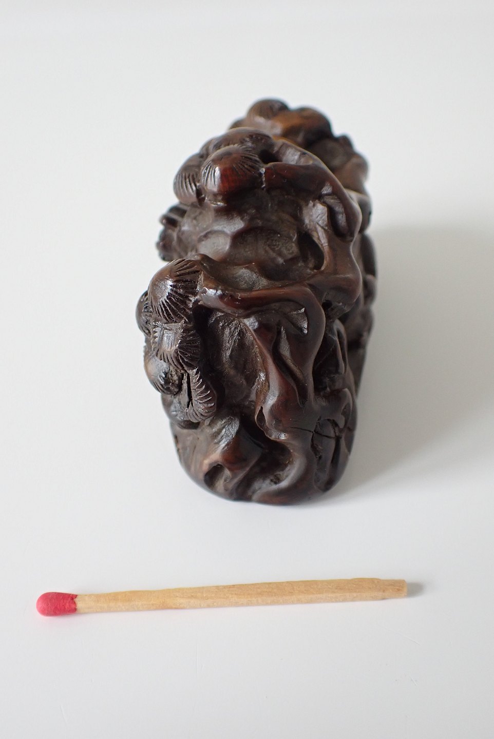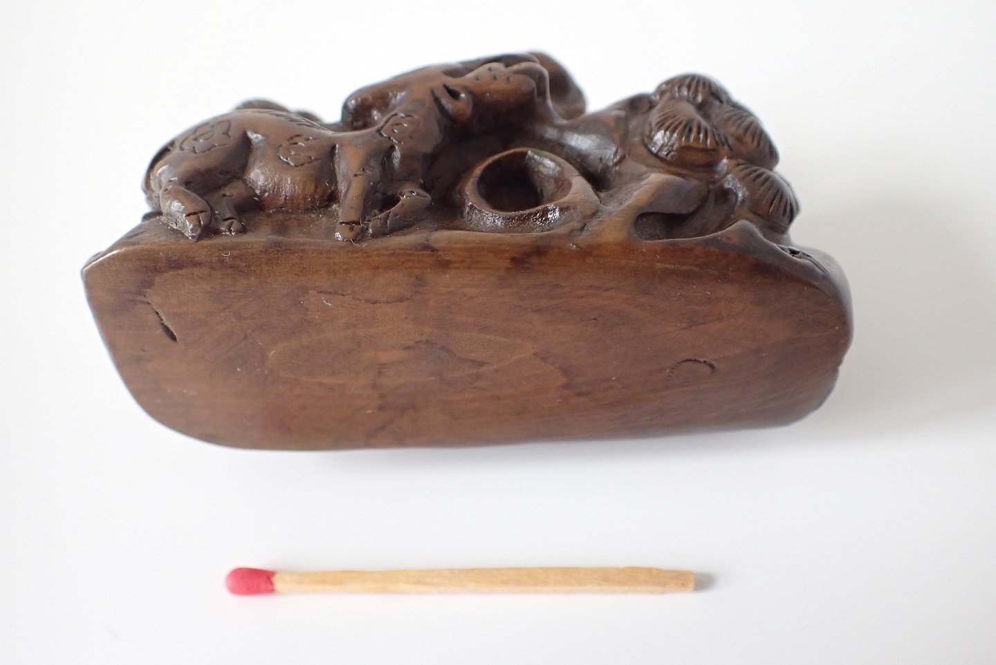 Lille Japansk træskæring (okimono) med hjort, japsndk klippede og krogede fyrretræer og bregne. Mål: 7,4 x 4,5 x 3,5 cm. I fin stand dog med et par overfladiske tørrevner.