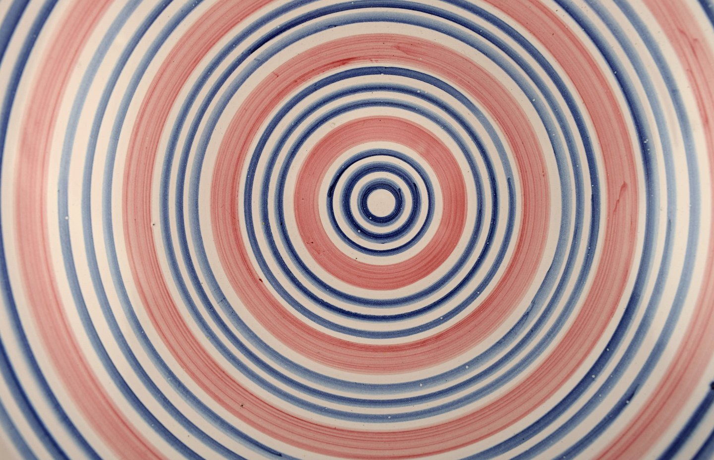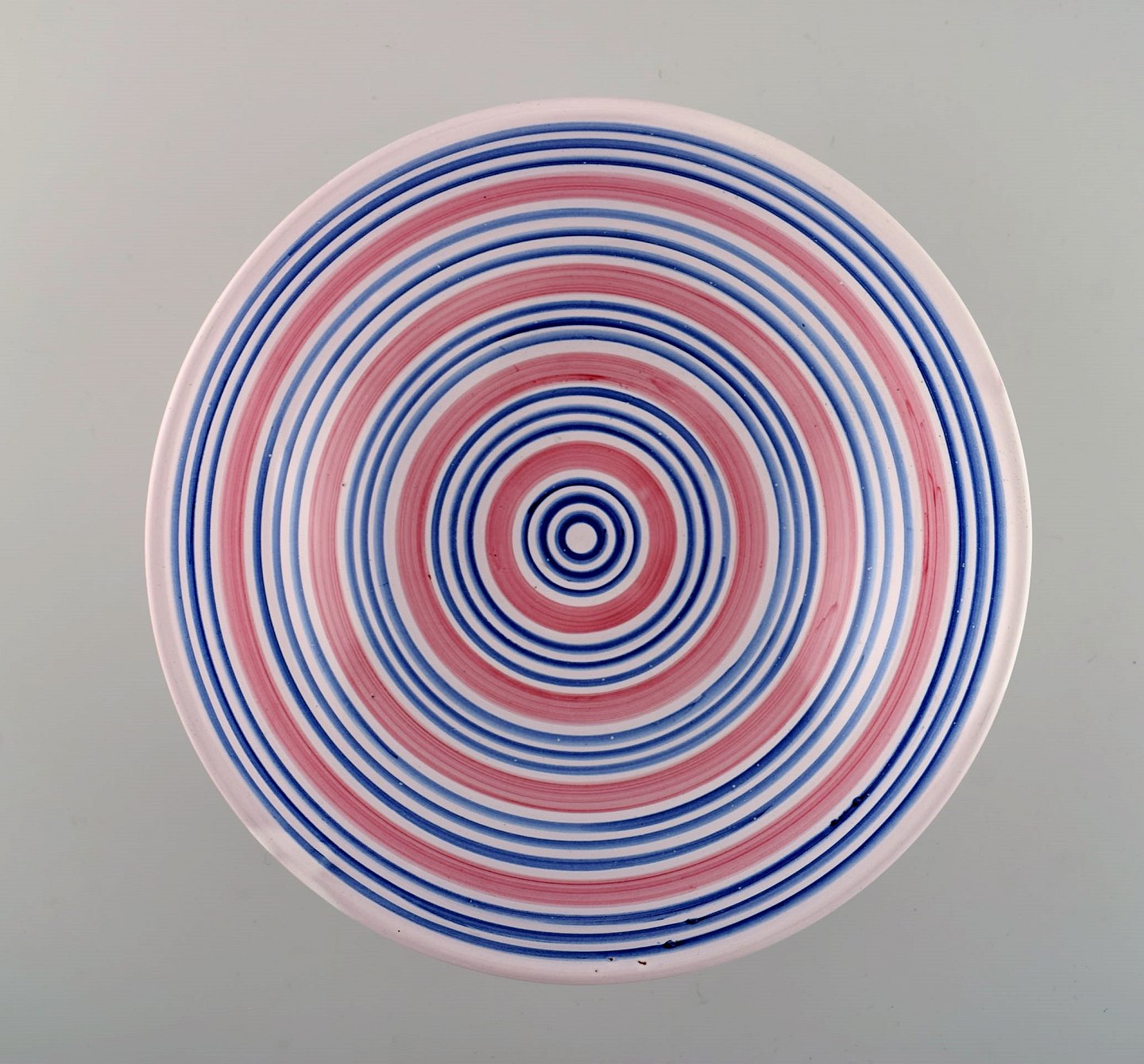 Ingrid Atterberg for Upsala Ekeby. Stor skål i glaseret stentøj. Stribet design i blå og lyserøde nuancer. Dateret 1951-52.
