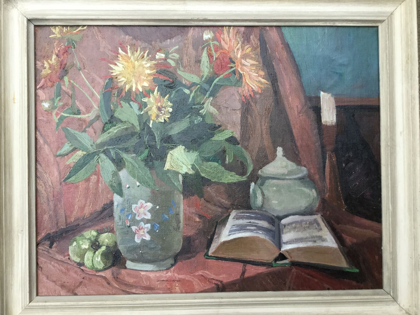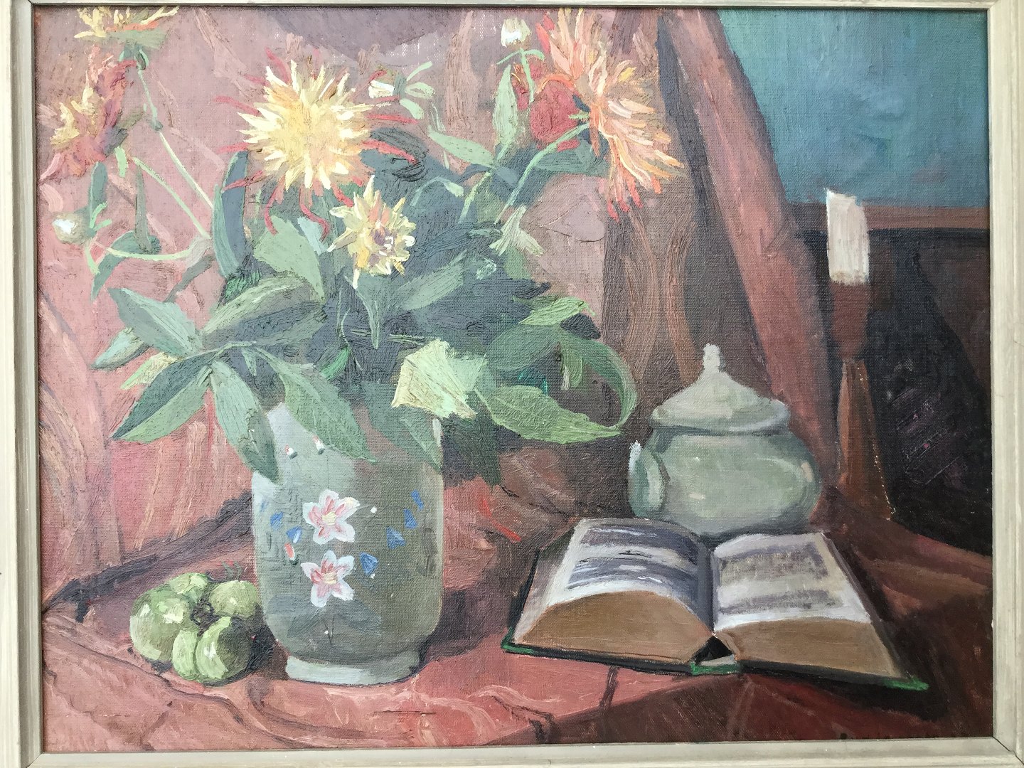 Opstilling med blomstervase, opslået bog mv. 1924.