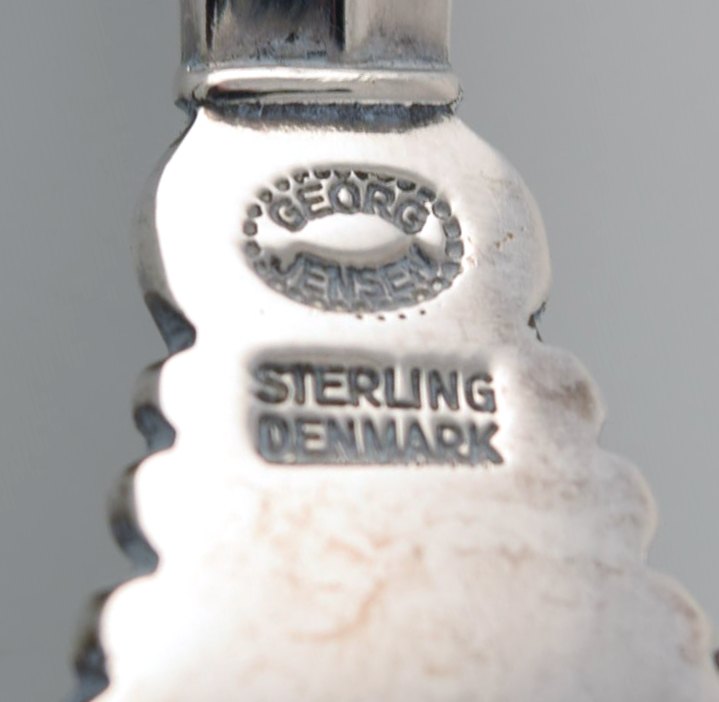 Text zugänglich auf Dänische: Johan Rohde for Georg Jensen. Dronning frokostgaffel i sterlingsølv. To stk på lager.