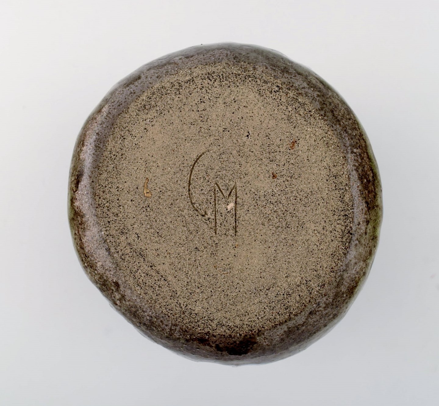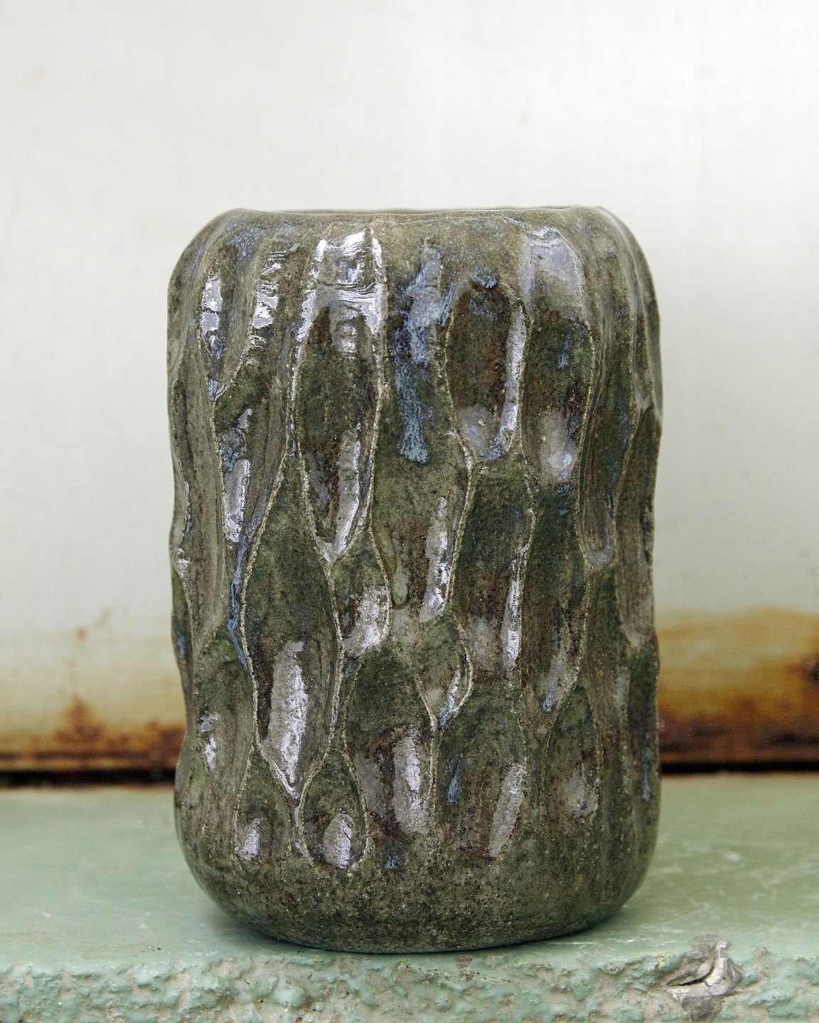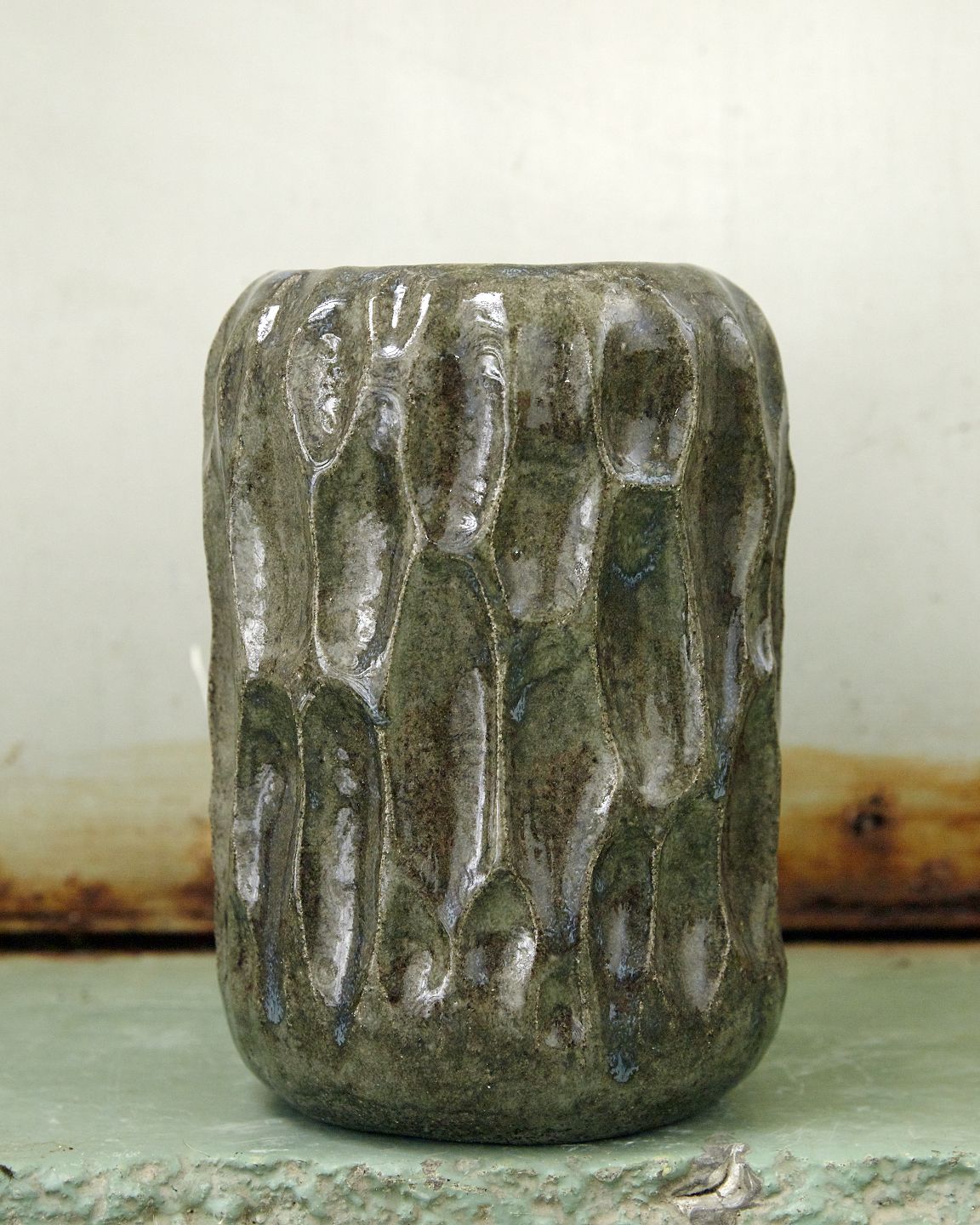 Christina Muff, dansk samtidskeramiker (f. 1971). Unikavase af gråt stentøjsler, lavaler, med udskæringer. Transparent, blank glasur med blå nuancer, som mineraler i jorden. En del af ‘soil’ serien.