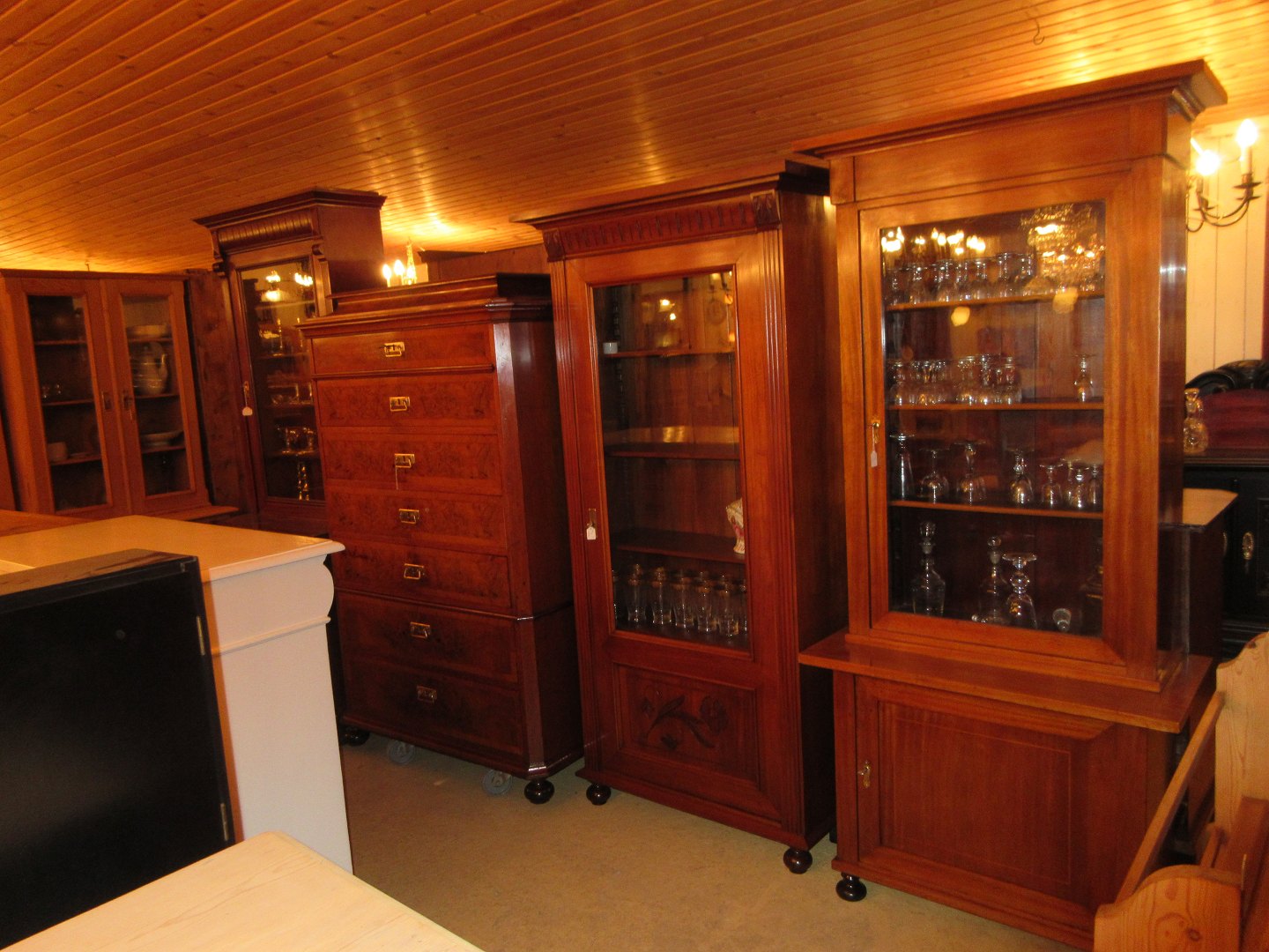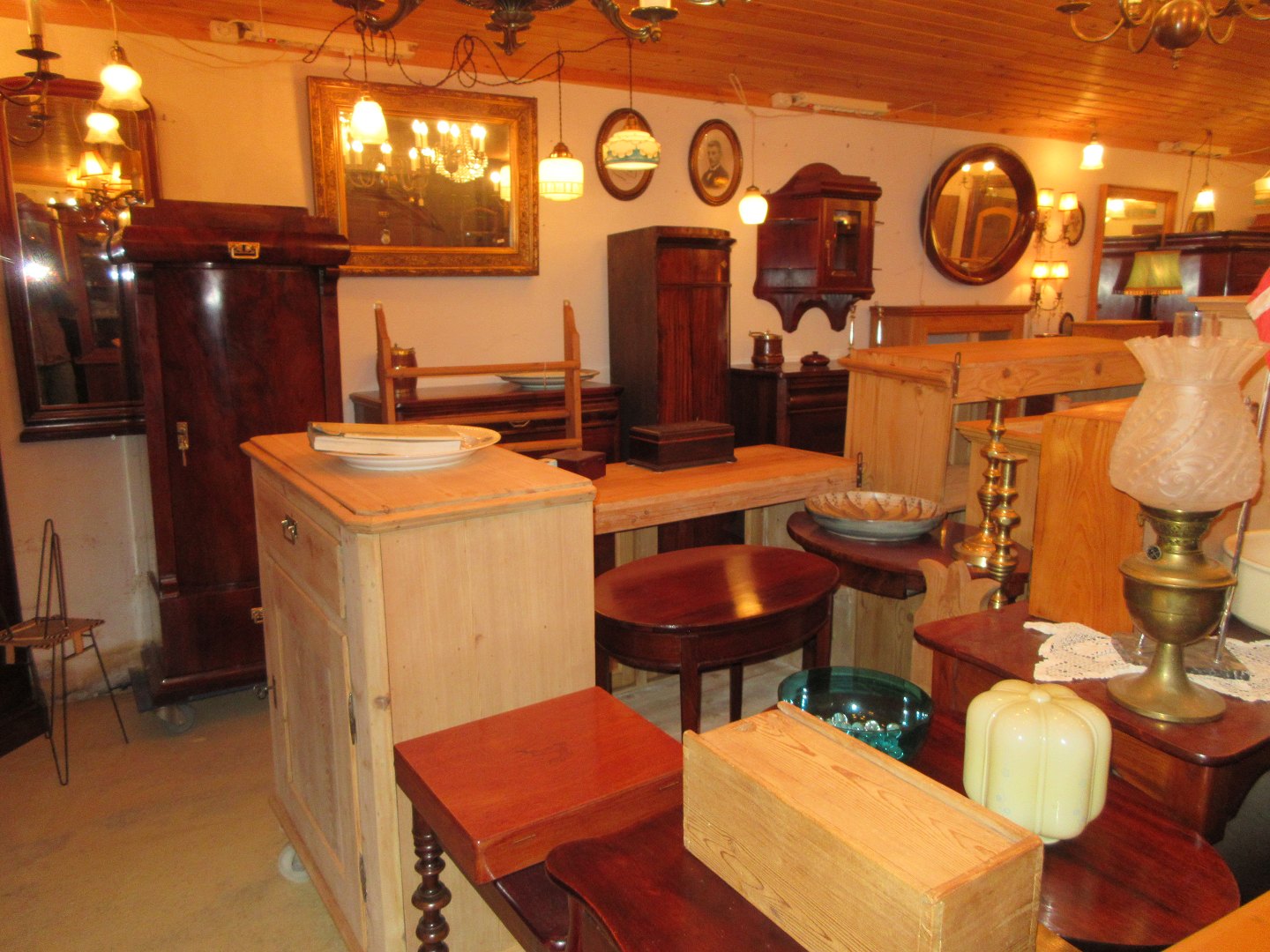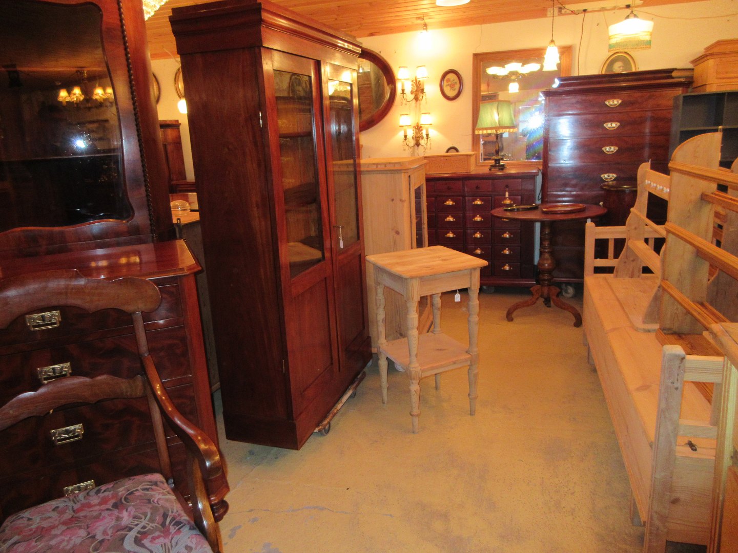 Stor salgsudstilling med restaurerede møbler håndpolerede mahognimøbler, afsyrede fyrretræsmøbler, malede træmøbler, kun originale gamle og antikke møbler.
