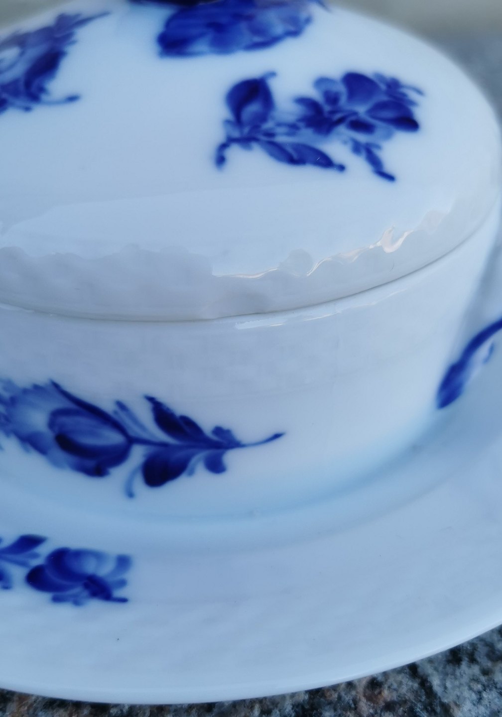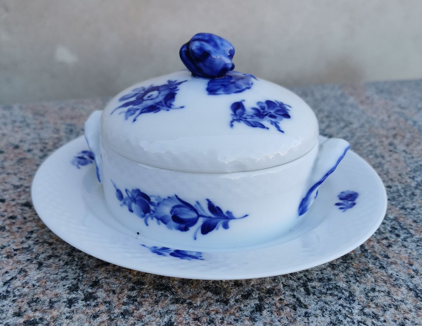 Smørskål i porcelæn med låg fra Royal Copenhagen i Blå Blomst. 2. sortering grundet lille skår på lågets kant (se foto). Glasur henover dette, hvorfor skaden er overset i forbindelse med produktionen. Derudover ingen skader eller reparationer. Fabriksmærket på bunden. Modelnummer 10/8076 Højde 9 cm.