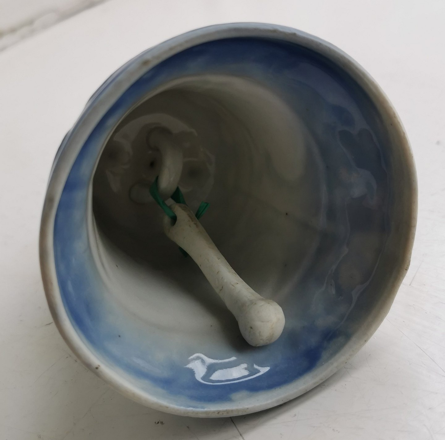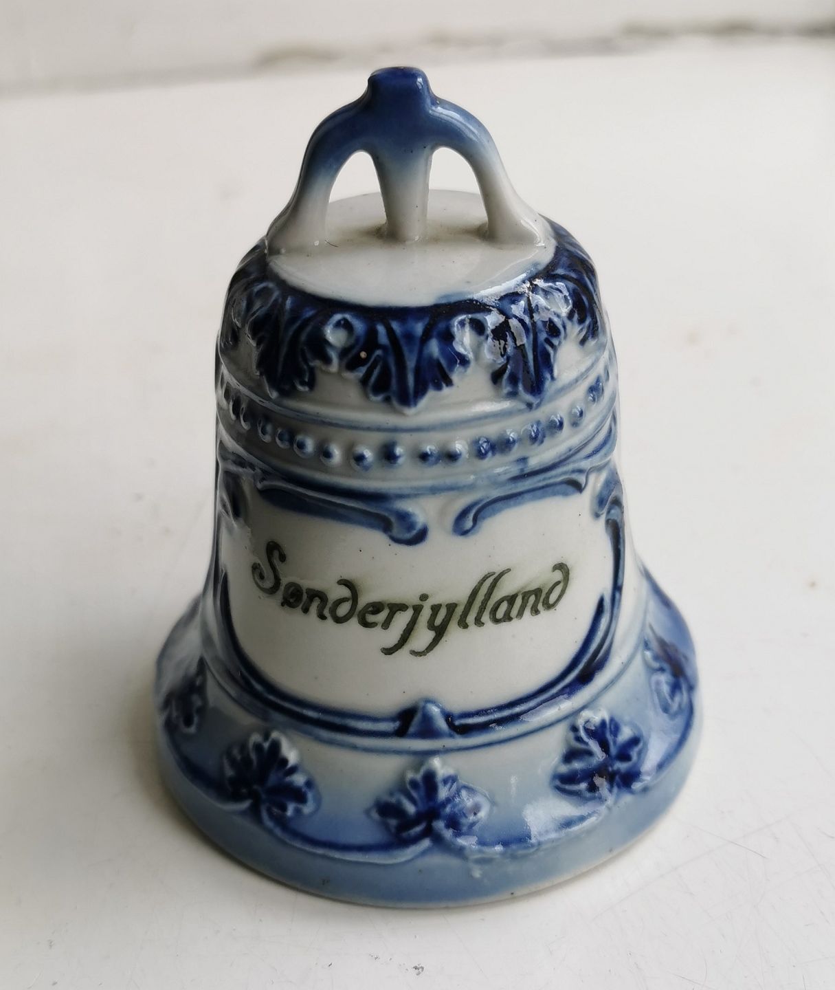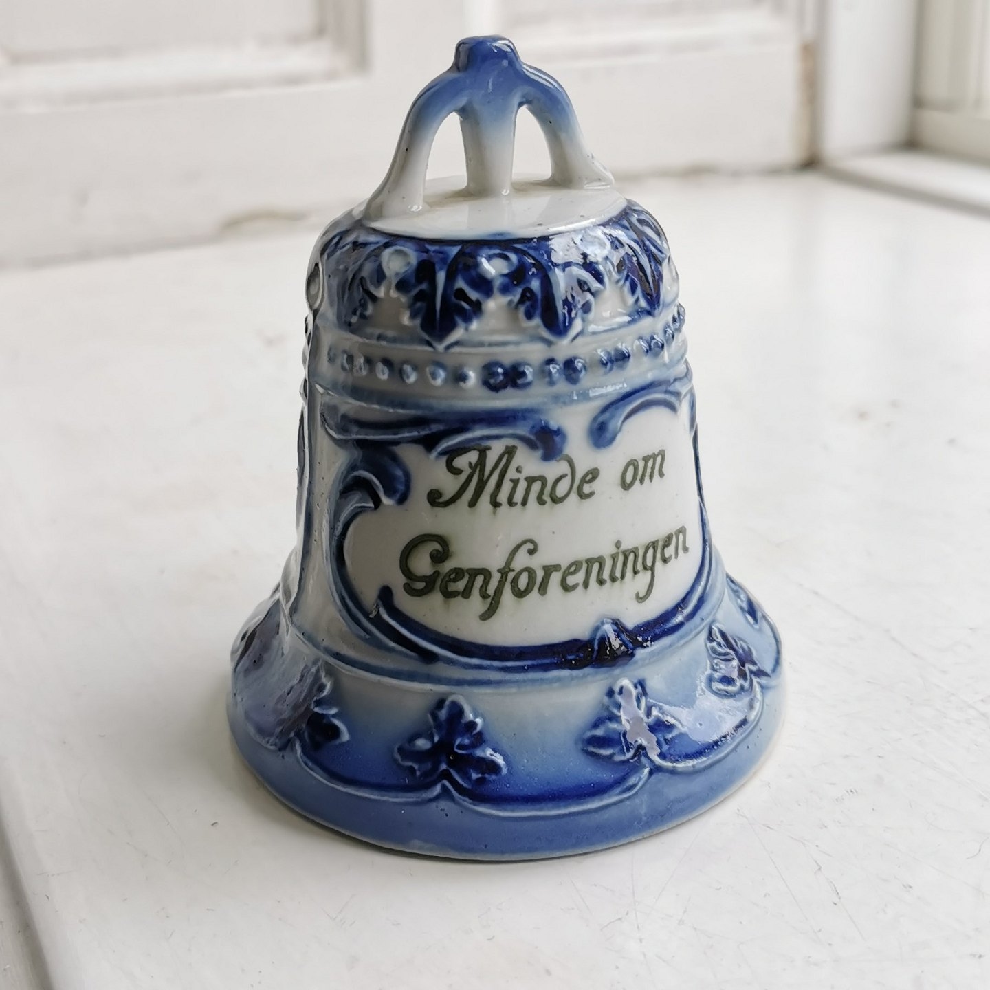 Klokke i porcelæn: "Minde om Genforeningen" på den ene side og "Sønderjylland" på den anden side. Formodes fremstillet i 1920 som en slagt souvenir / erindringsgave i anledning af genforeningen af Sønderjylland. Producenten er ukendt. Med stor sansynlighed fremstillet i Tyskland. Ingen fabriksmærke. Fremstår i god stand uden skader eller reparationer. Mål: H. 10 cm.