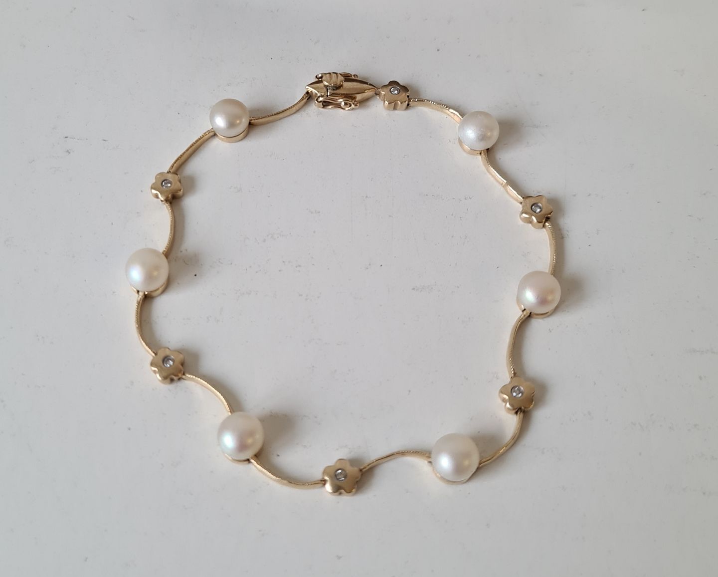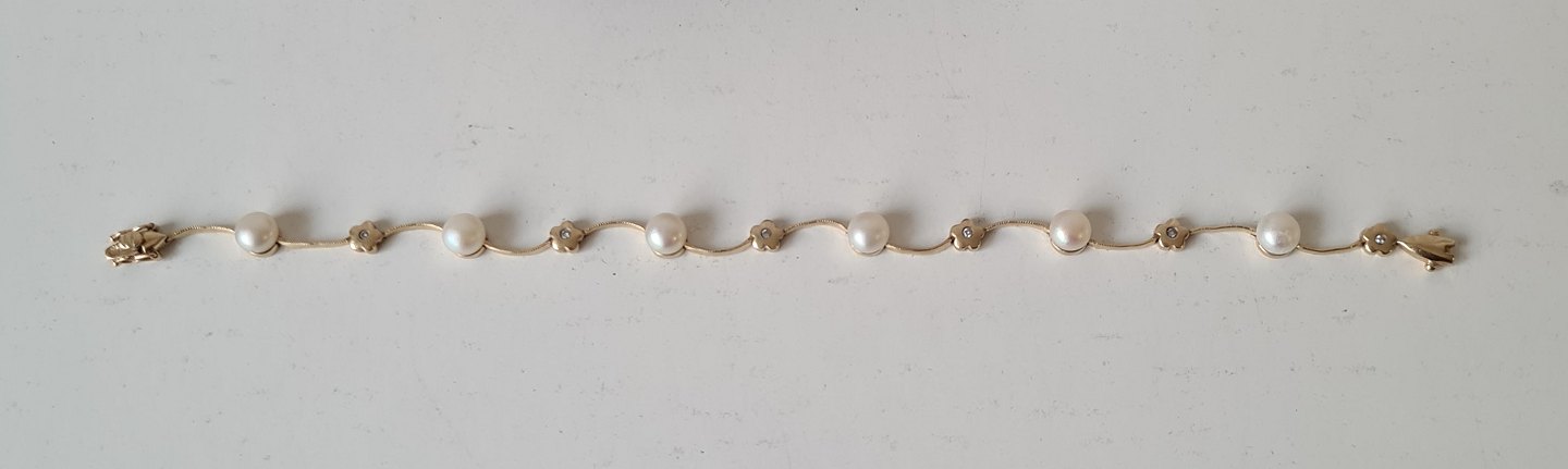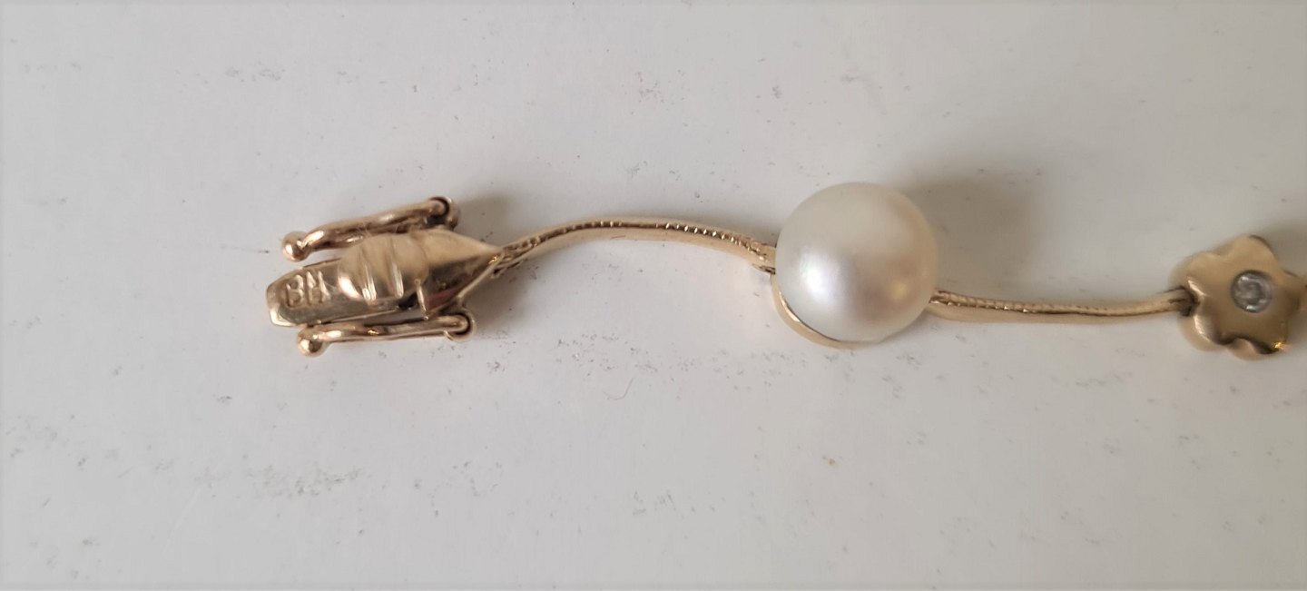 Bernhard Hertz smukt og feminint vintage armbånd i 14 kt guld med 6 perler og 6 brillanter.
