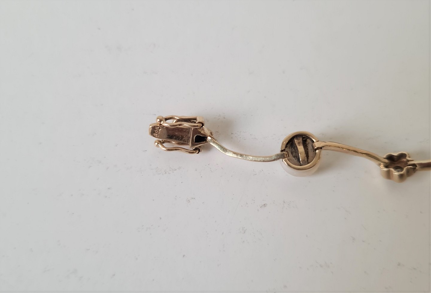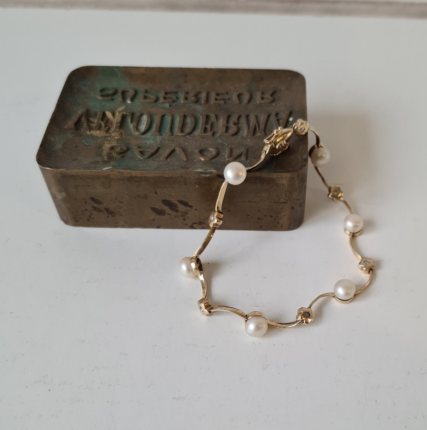 Bernhard Hertz smukt og feminint vintage armbånd i 14 kt guld med 6 perler og 6 brillanter