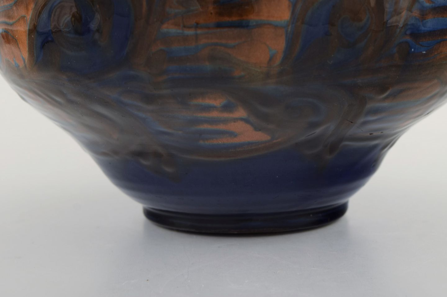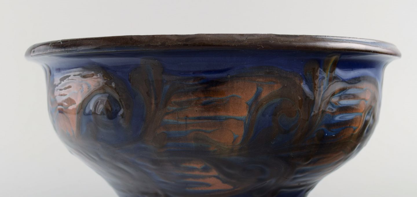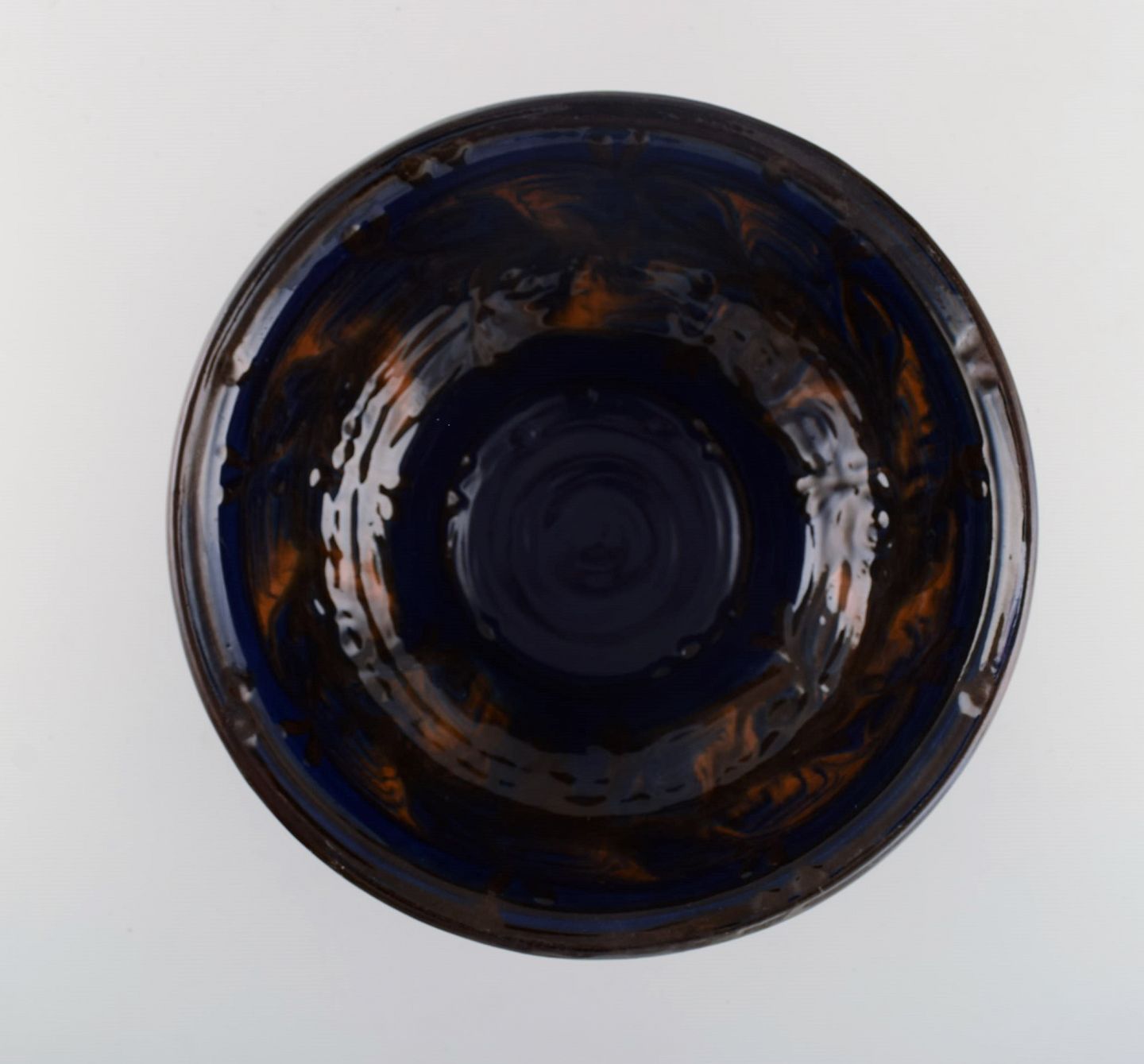 Kähler, HAK. Skål i glaseret stentøj. Orange bladværk på blå baggrund. 1930/40'erne.