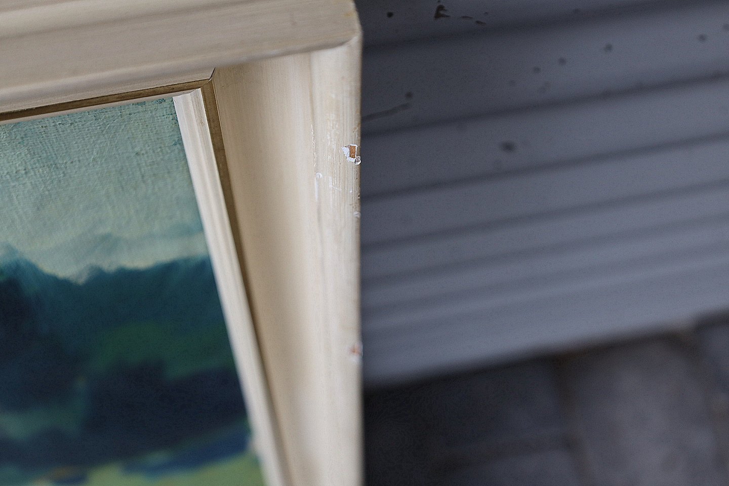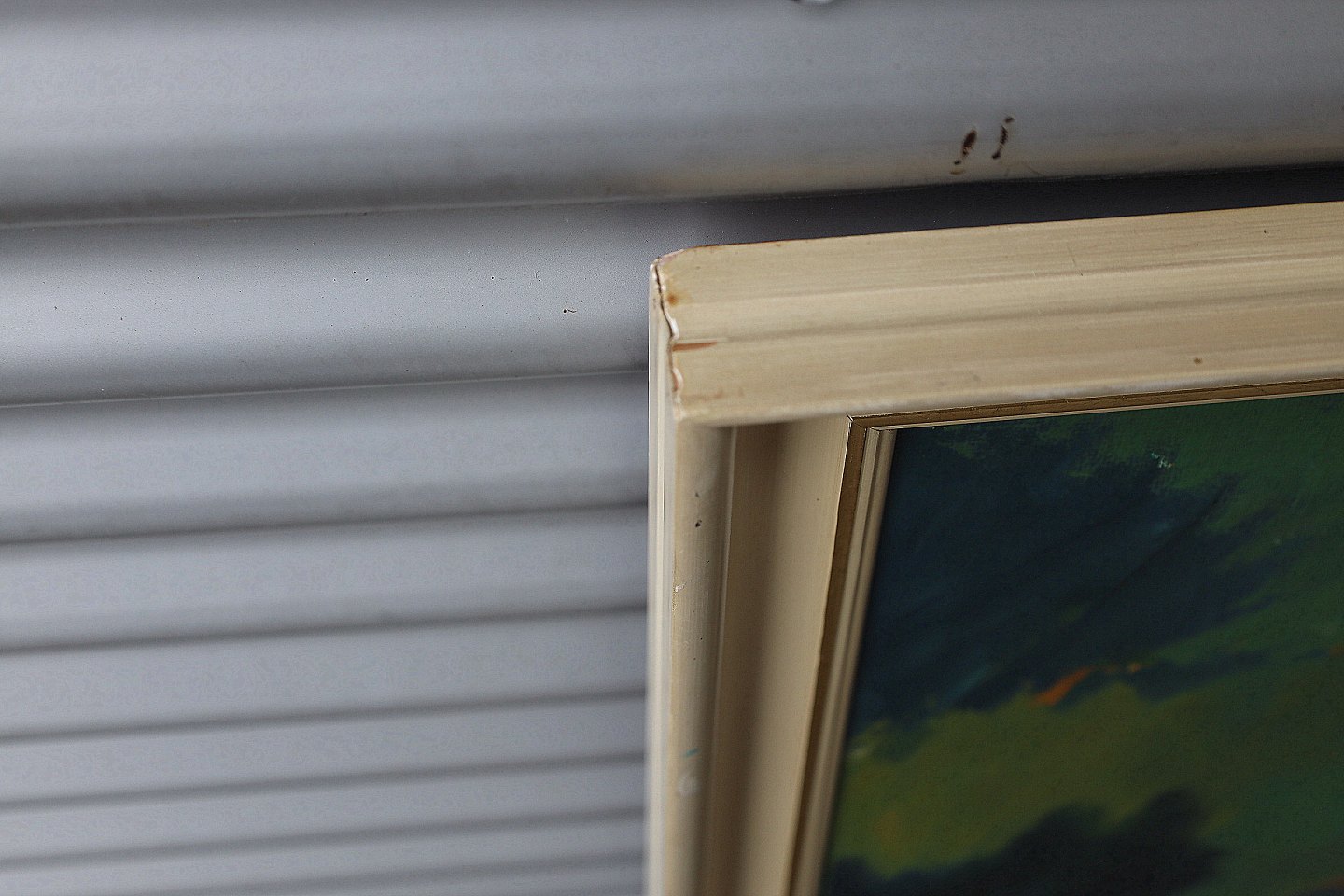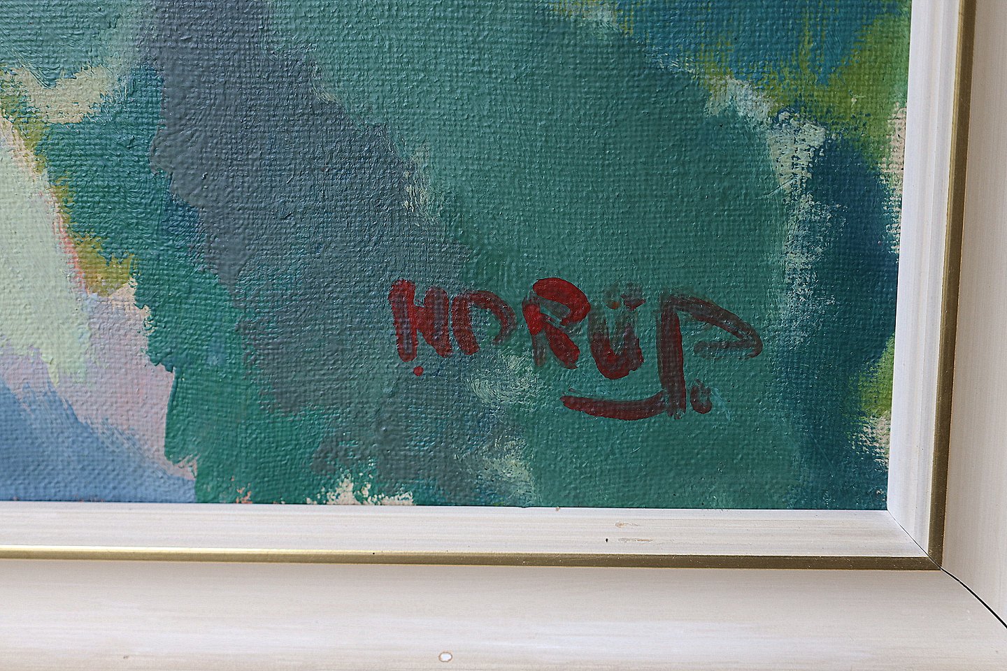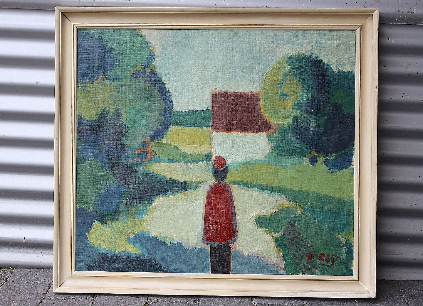 Kunstmaler Knud Horup. Maleri. Dreng, der går ad markvej, hen mod lade. Signeret Horup