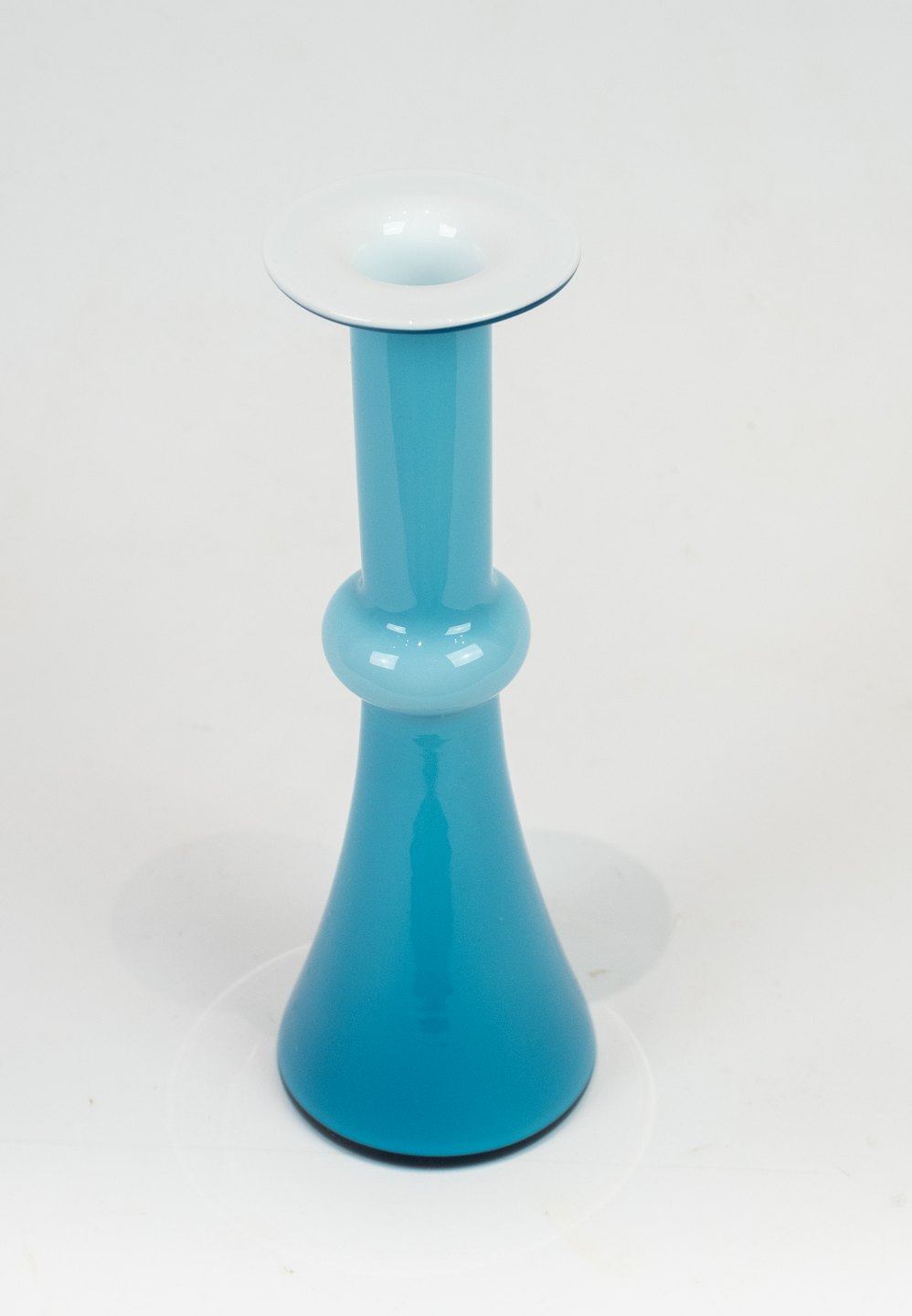 Blå glasvase med hvidt opal glas indvendig fra serien "Carnaby". Glasvasen er designet af Christer Holmgren c. 1960 og fremstillet af Holmegaard.