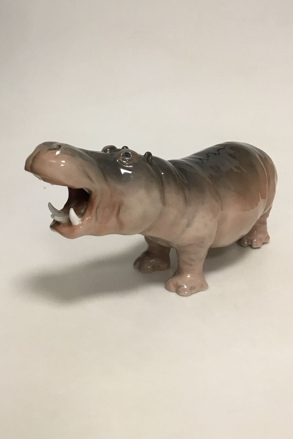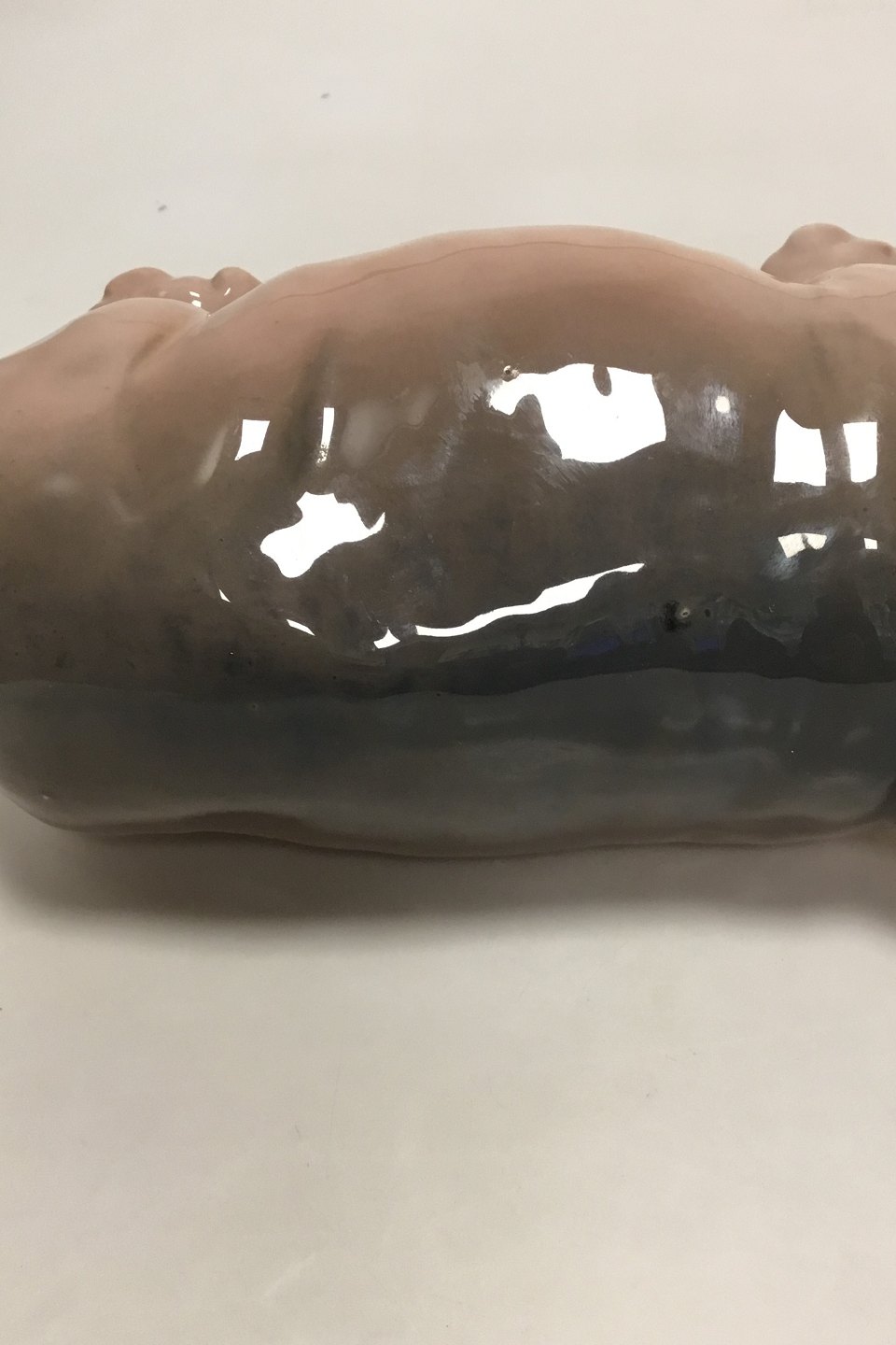 Royal Copenhagen Figur af flodhest No 309. Måler 34 cm. Har et par sorte pletter i glasuren og hul i munden, men ellers i fin stand. Fra 1889-1922