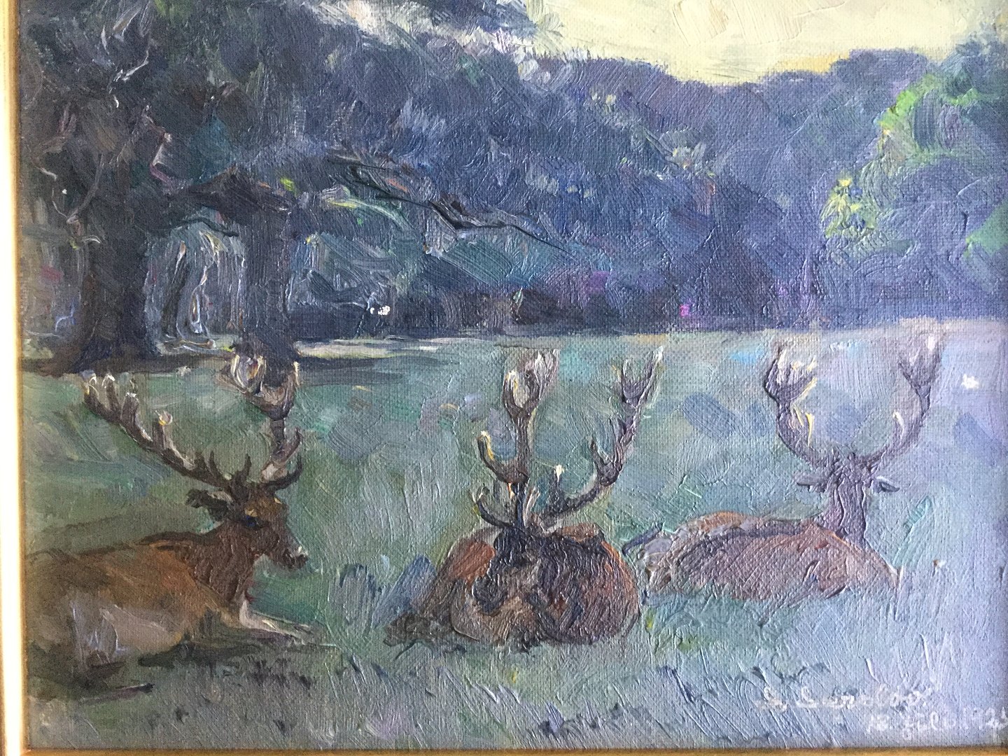 Maleri af Frederik Larsen-Særsløv 1925 - Hvilende Kronhjorte ved skov.