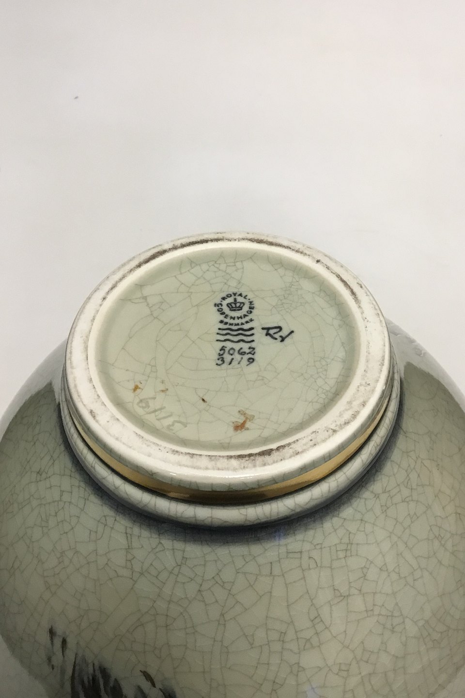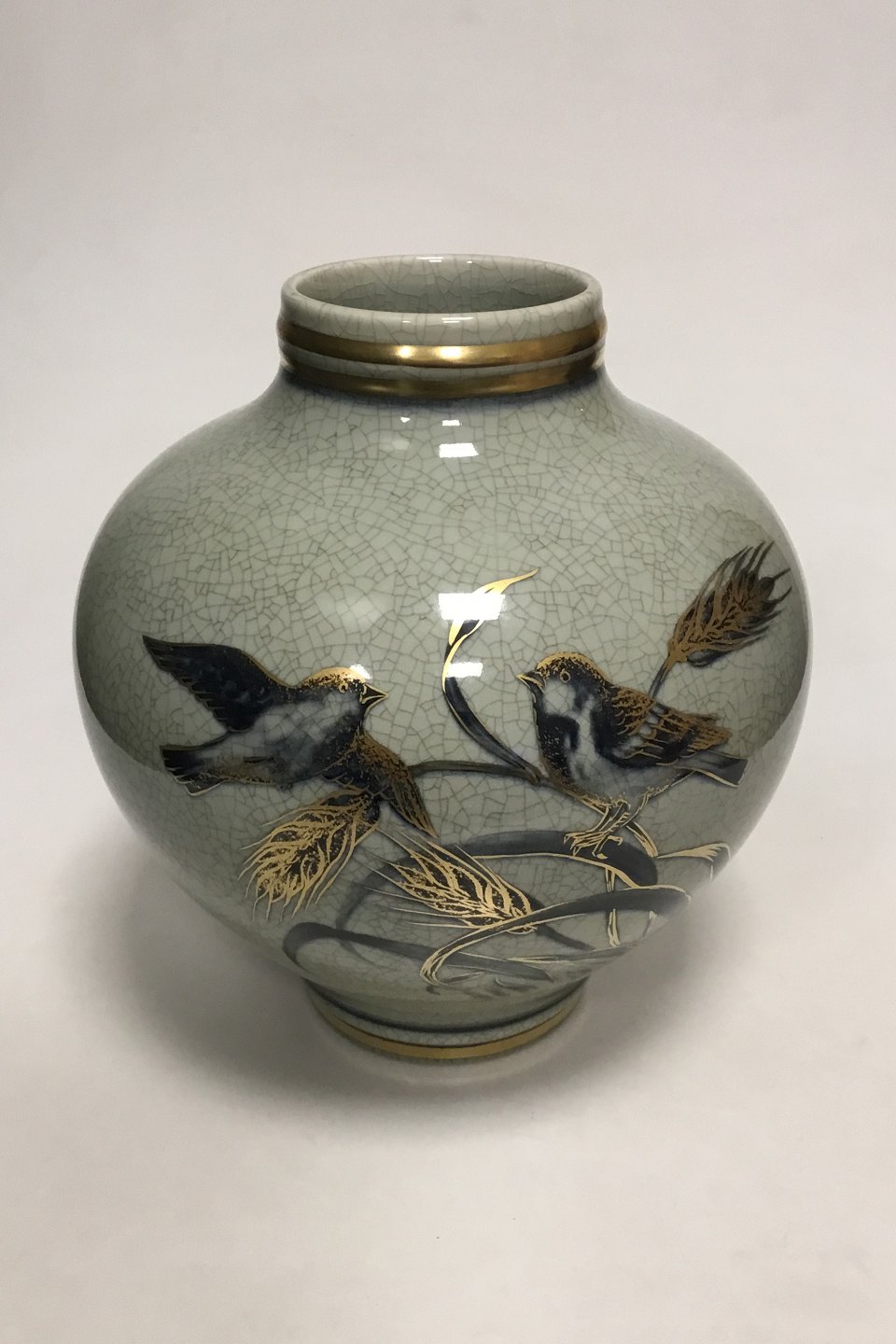 Royal Copenhagen Stentøjsvase med krakele glasur, dekoreret med fugle og hvedeplanter i grøn glasur, stafferet med guld No 5062/3119