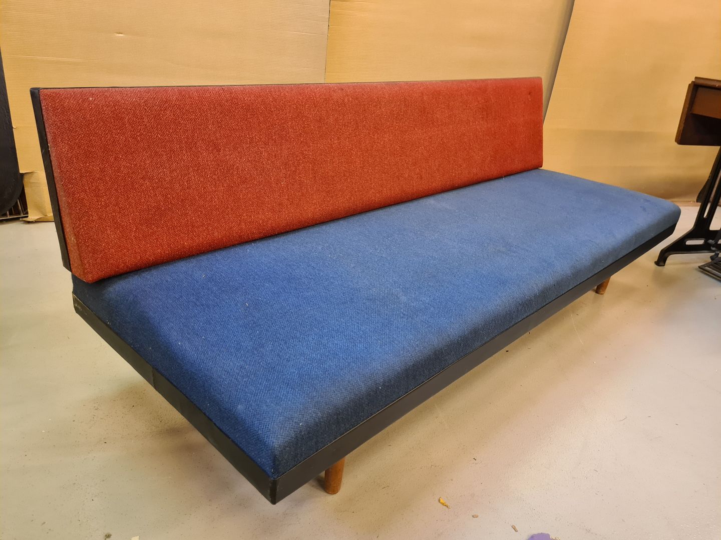 Blå daybed i bøgetræ og sort nappa fra 1960´erne. Medfølgende røde ryglæn er løst.
