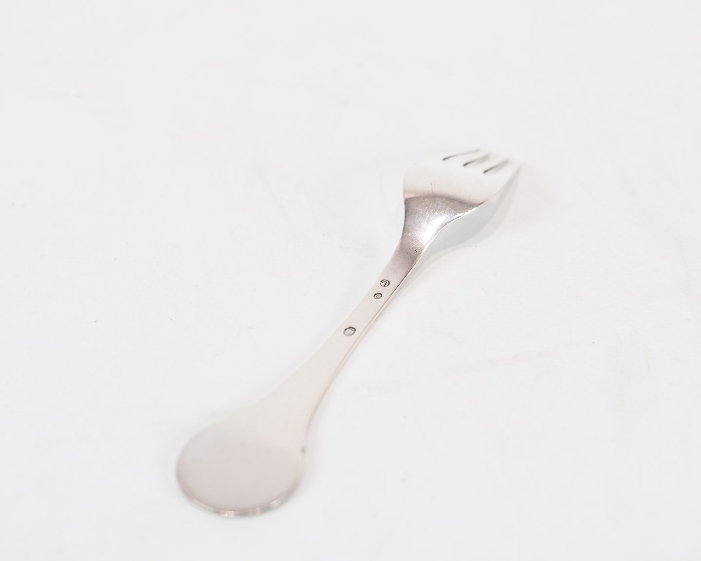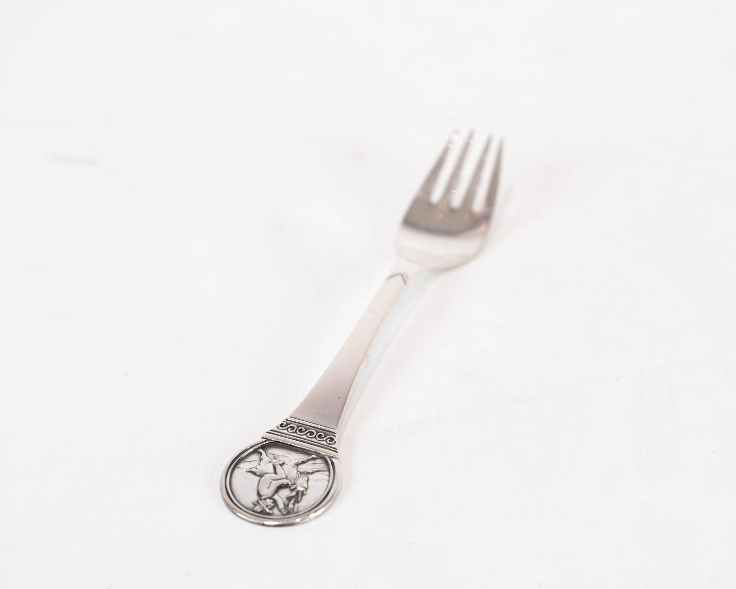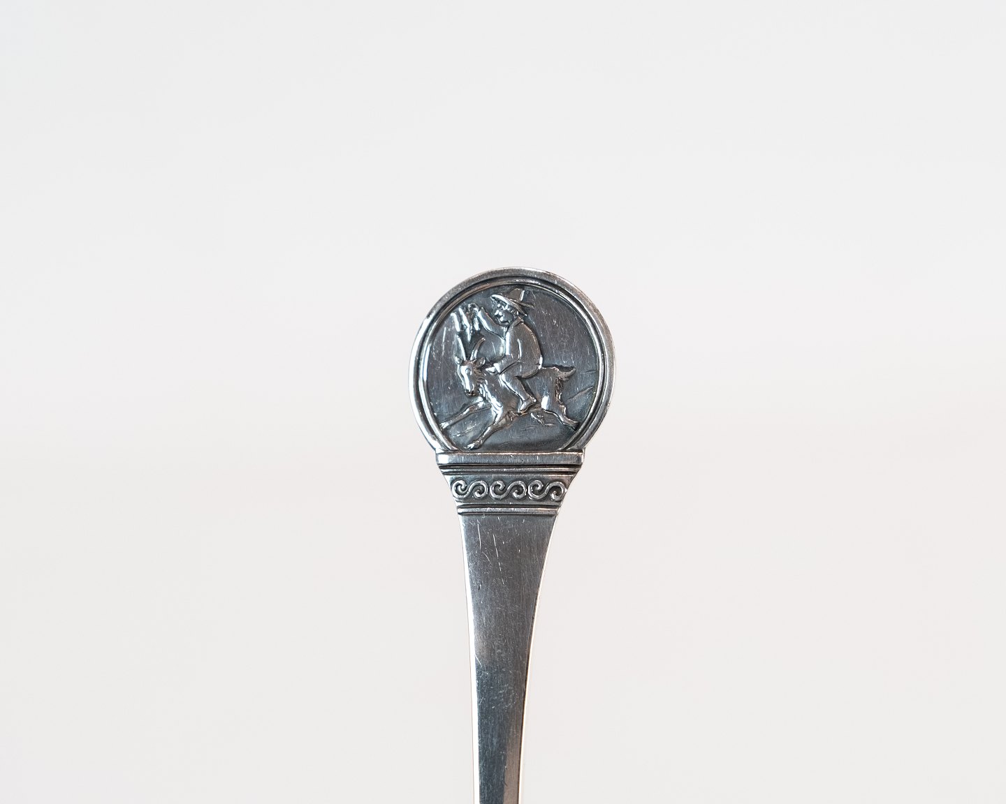 Barnegaffel med motiv af H.C. Andersens Klodshans i tretårnet sølv.