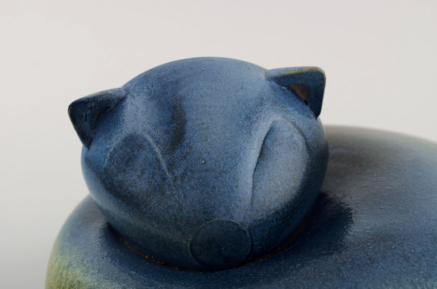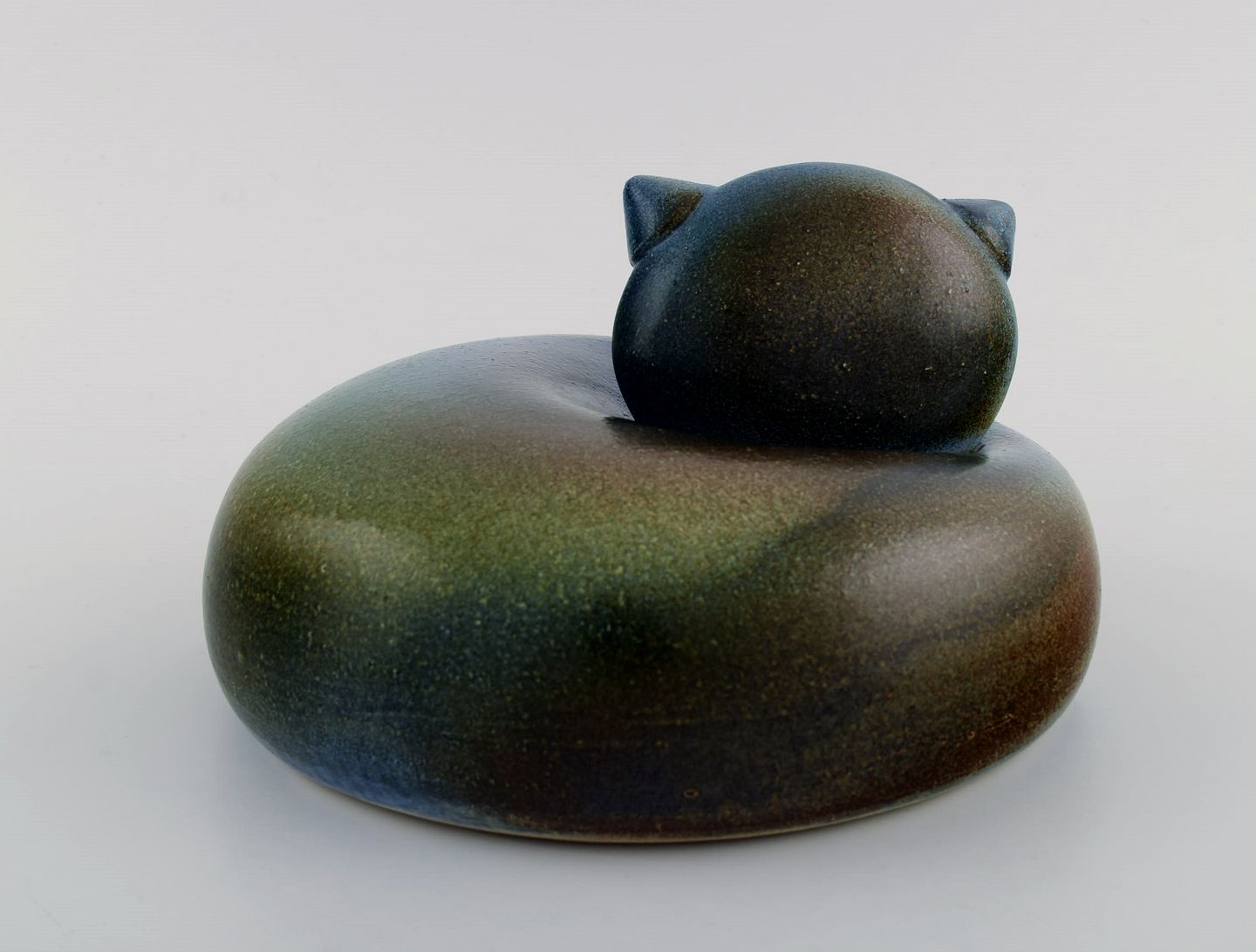 Europæisk studio keramiker. Stor unika figur af liggende kat. Smuk glasur blågrønne nuancer. 1980'erne.