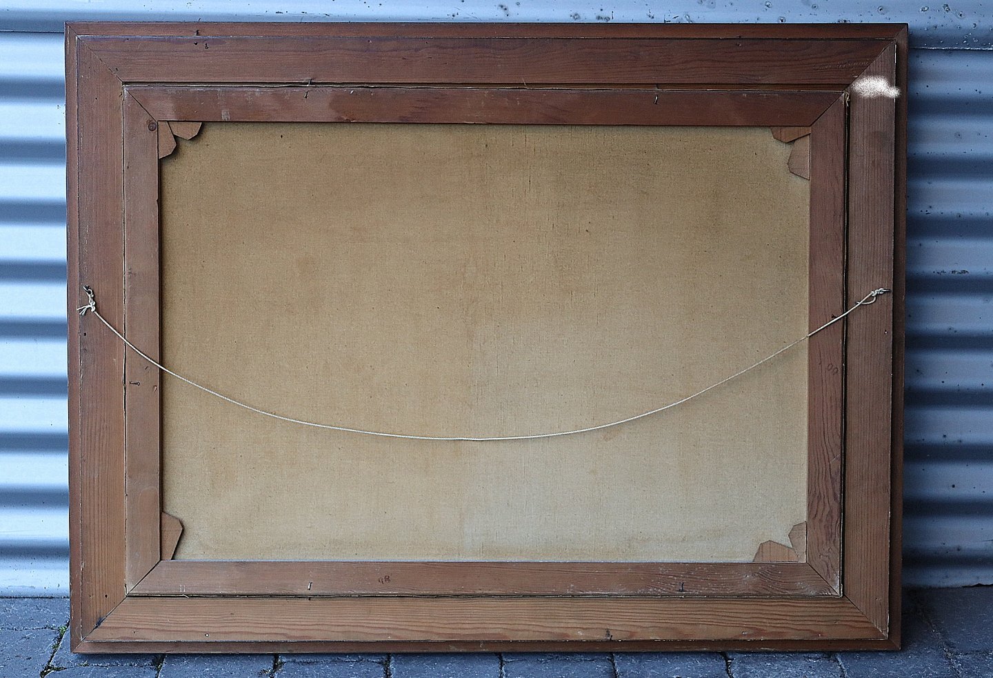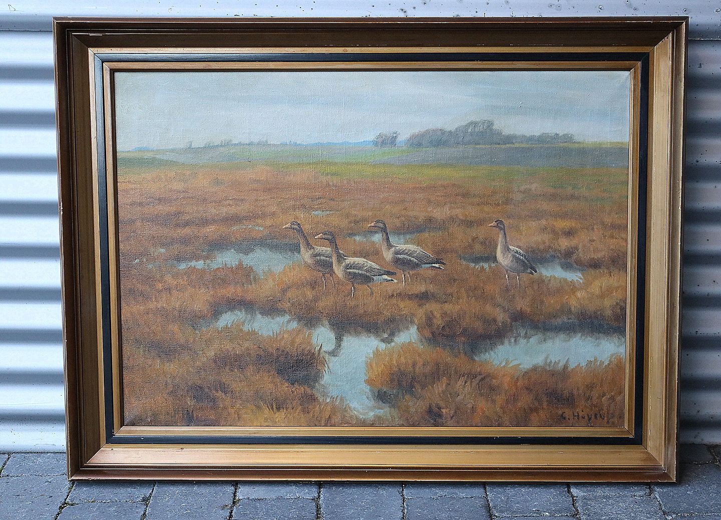 Maleri, Carl Høyrup (1893-1961). Gæs der går mellem græs og vand. Signeret C. Høyrup. Maleriet er i guldramme med sort kant, rammen har brugsspor