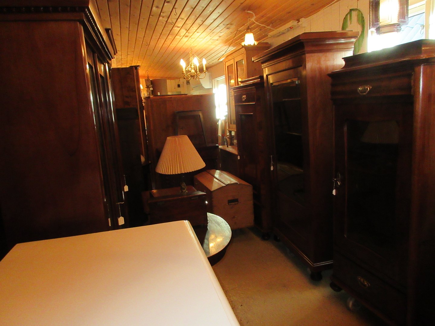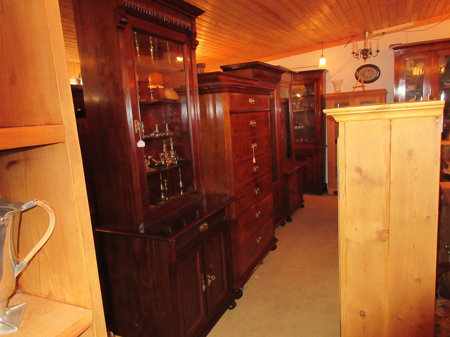 Stor salgsudstilling med restaurerede møbler håndpolerede mahognimøbler, afsyrede fyrretræsmøbler, malede træmøbler, kun originale gamle og antikke møbler.